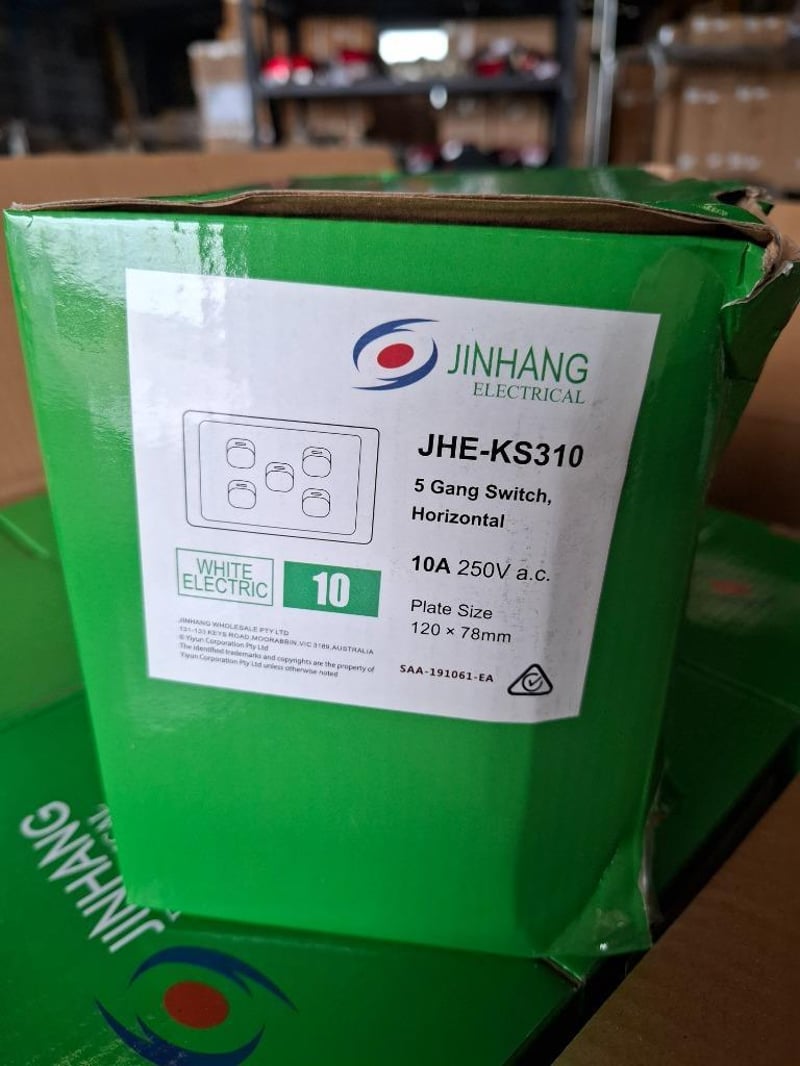 RRP $5200 Combined, 10A 5 gang wall light switch-slimQTY: 100pcsMODEL: JHE-KS310PRODUCT DIMENSIONS: 120mm x 78 mm