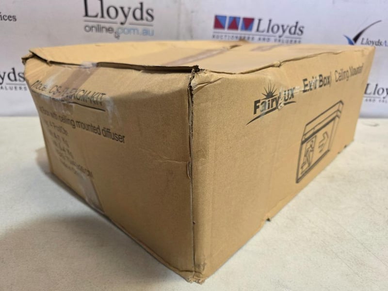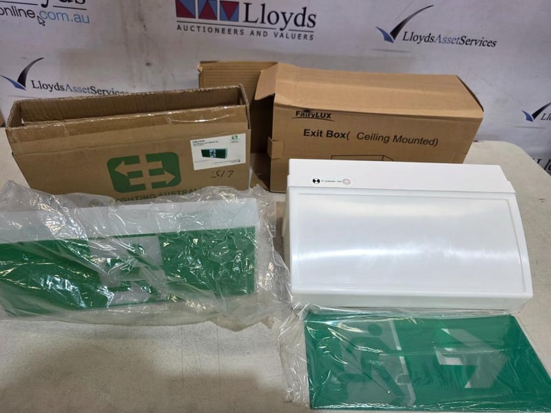 RRP $ 663.18 Combined, FariyLux Ceiling Mounting Wide Body Box Exit LightQTY: 3pcsMODEL: CS-FL-EXCM-KIT-NZPRODUCT DIMENSIONS: 380mm x 150mmAssorted box of electrical exit signs. CS-FL-EXCM-KIT and DBOXW