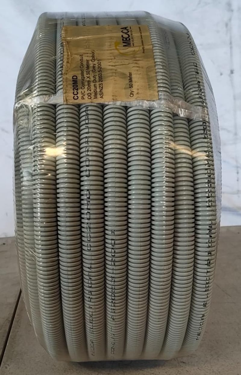RRP $129, MECCA Flexible Corrugated Conduit 20mm MD Grey 50MQTY: 1pcsMODEL: CC20MDPRODUCT DIMENSIONS: 20mm x 50m