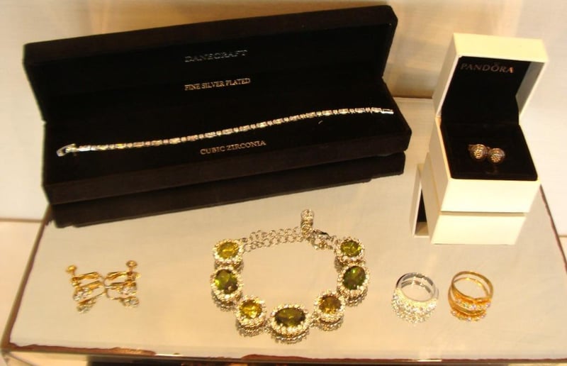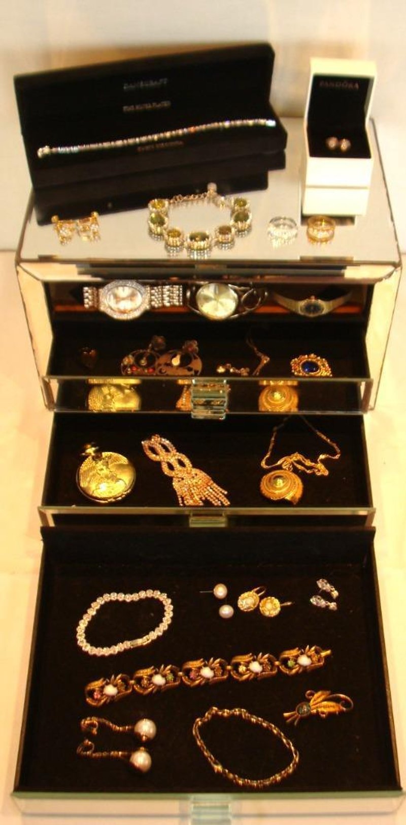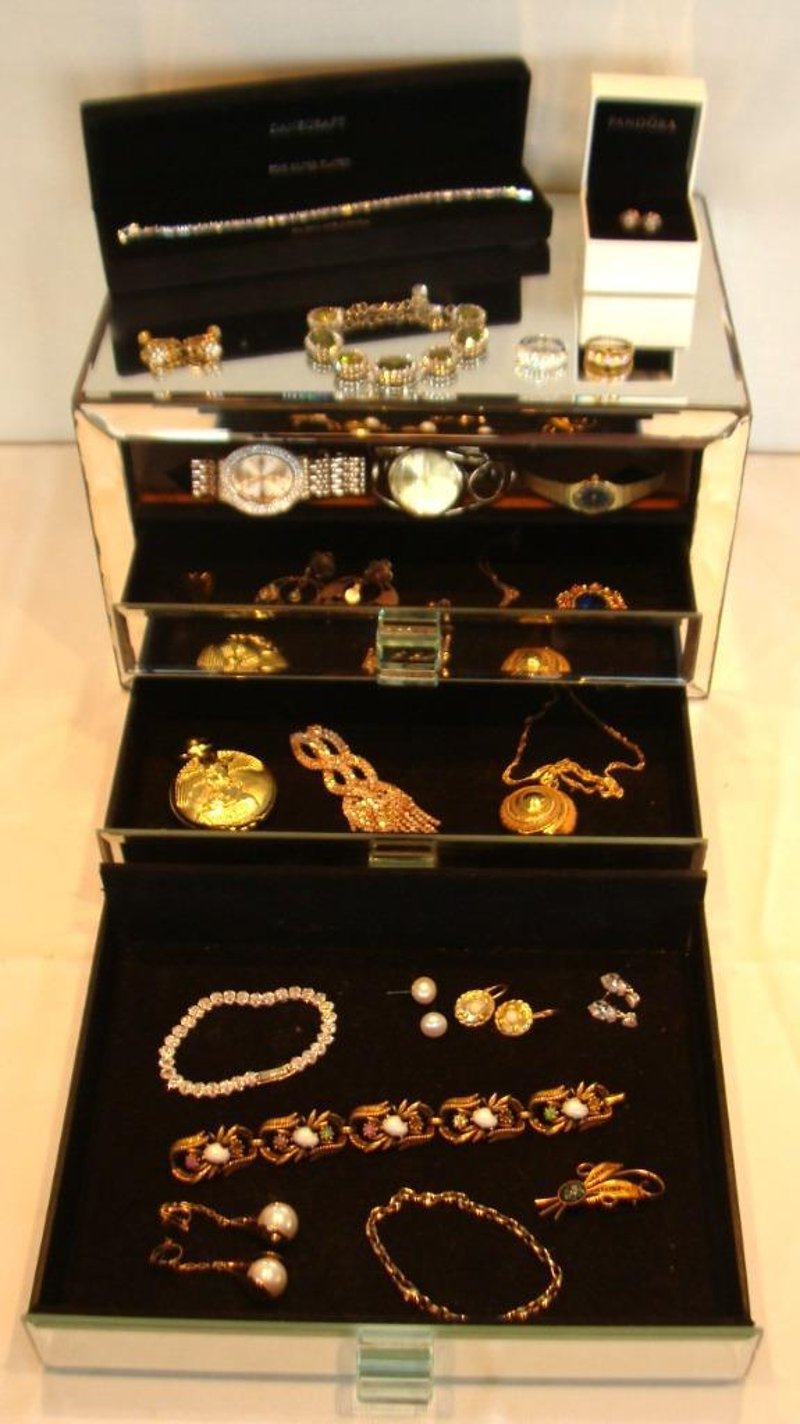 JEWELLERY BOX WITH JEWELLERY COLLECTION INCLUDING NATURAL PEARLS, CORO, NATURAL OPAL, STERLING SILVER, PANDORA, SWAROVSKI & MOREItem Size: Height: 30cm, Width: 13cm, Depth: 7cm, Weight: 2KgCondition: Good - Refer To Images6C586362+1