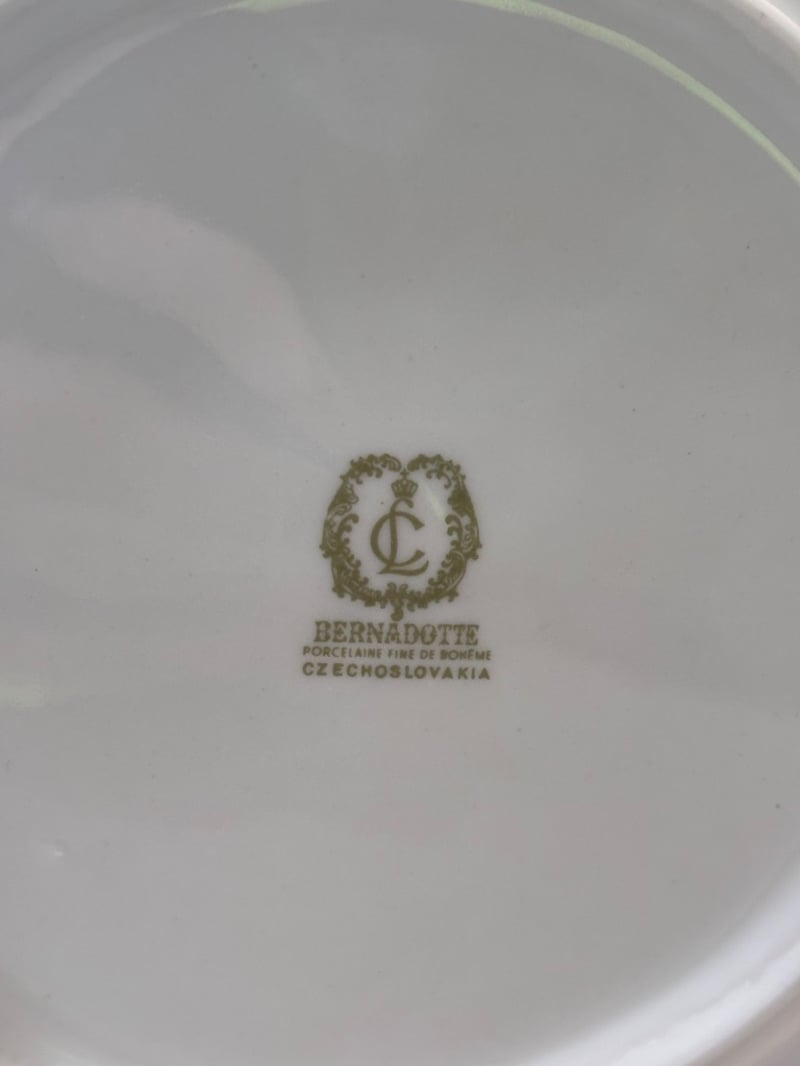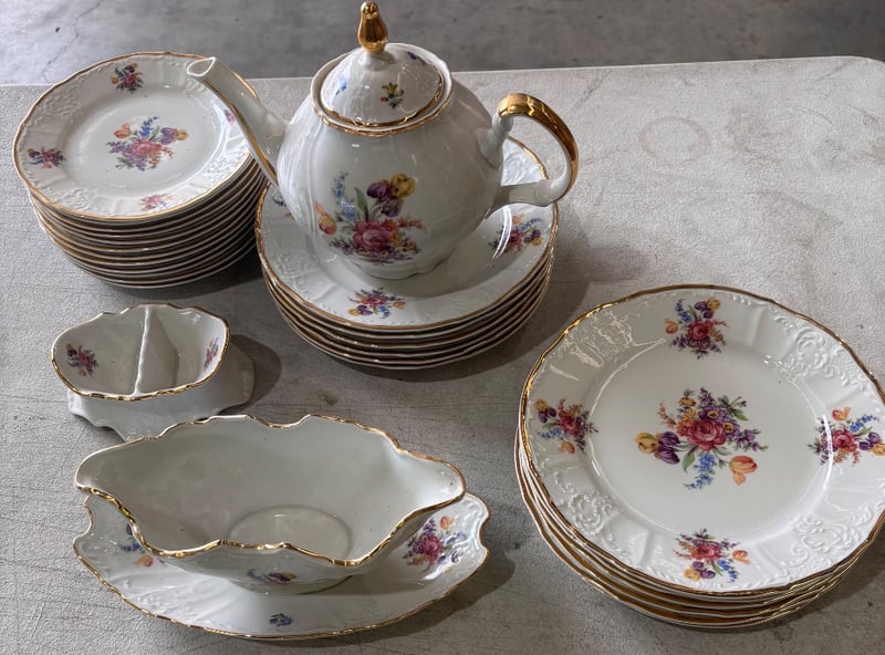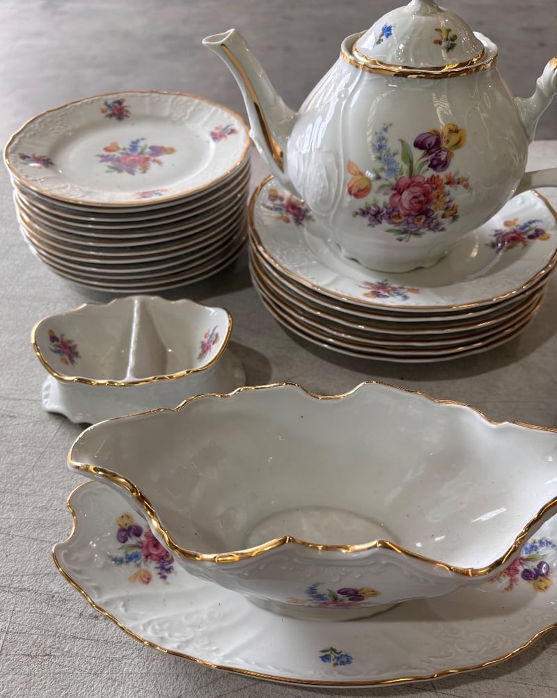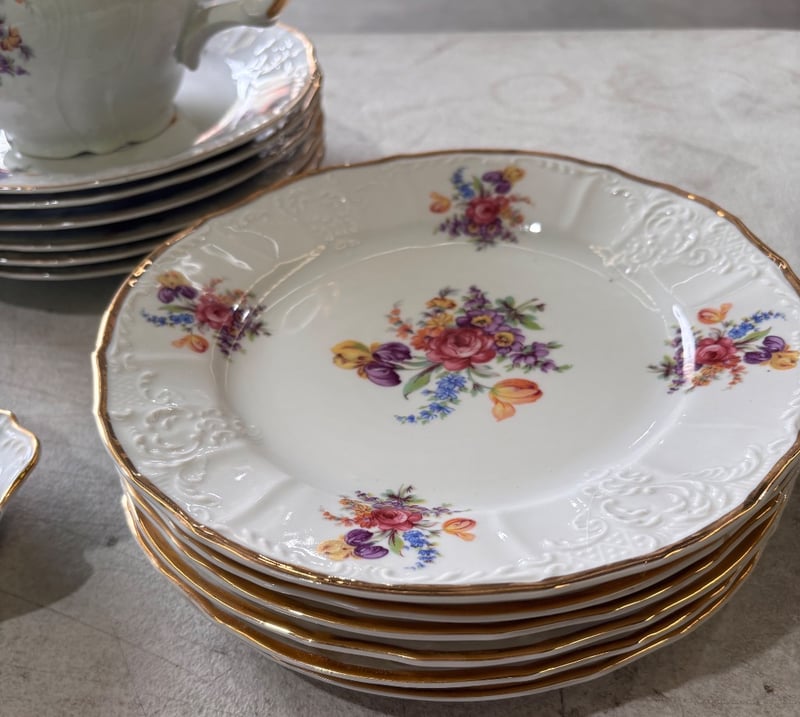 Eastern European hand painted white with colourful flowers porcelain set. Including dining plates, gravy bowl, small plates