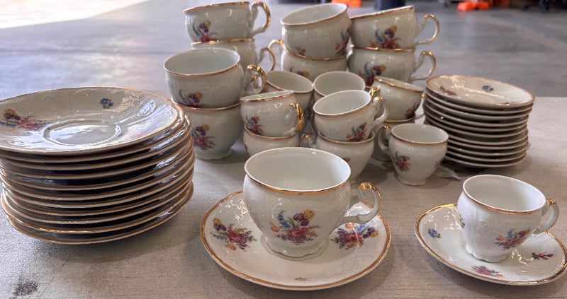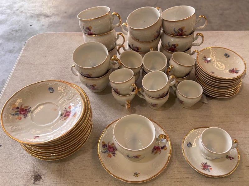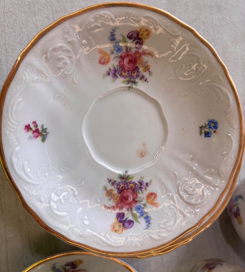 Eastern European hand painted white, Gold colours porcelain set. Including teacups and saucers