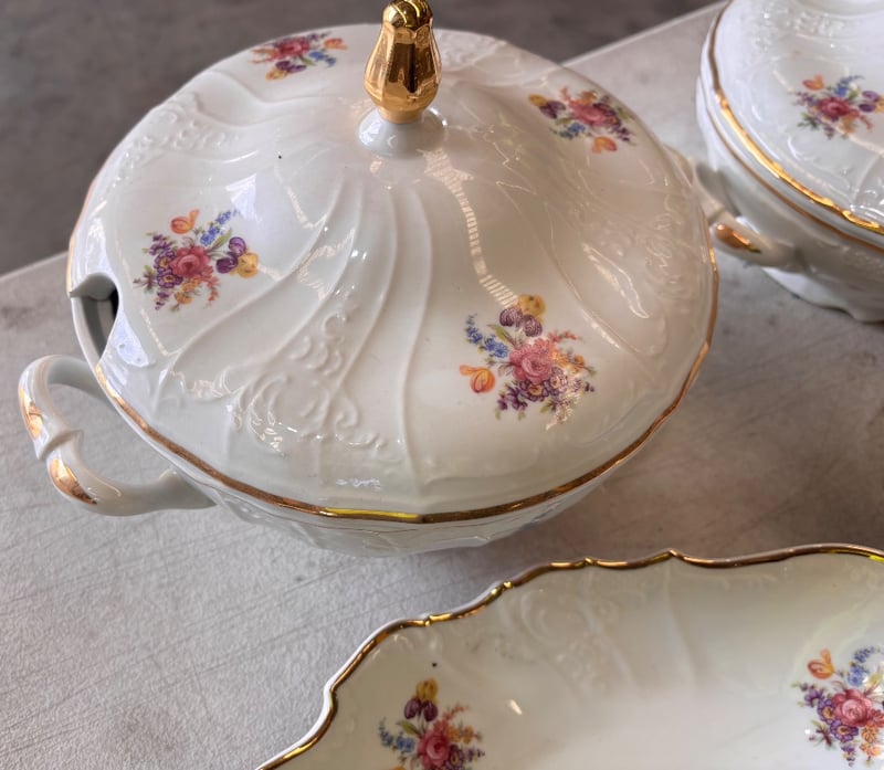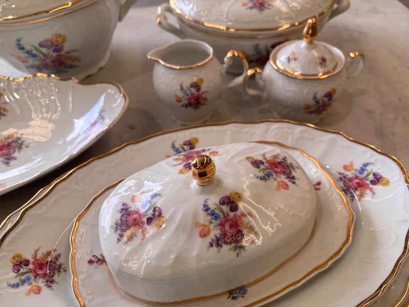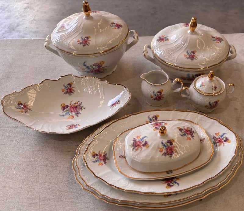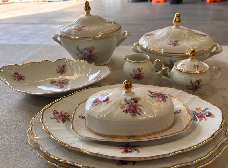 Eastern European hand painted White, Gold colours porcelain set. Including serving plates, butter dish Note; Sold as lot