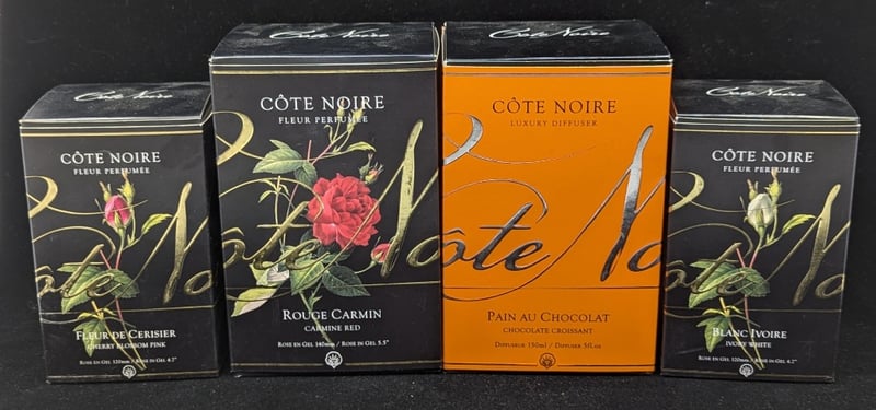 COTE NOIRE FLOWER PERFUMES AND DIFFUSERThree Flower Perfumes Including Ivory White, Cherry Blossom Pink, Carmine Red,Pain Au Chocolat Luxury DiffuserCondition: Good - Refer To Images11B587863+3