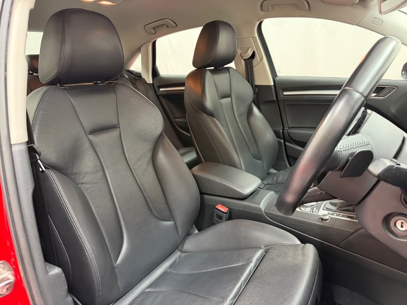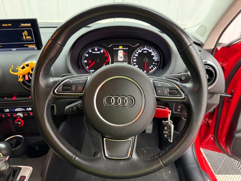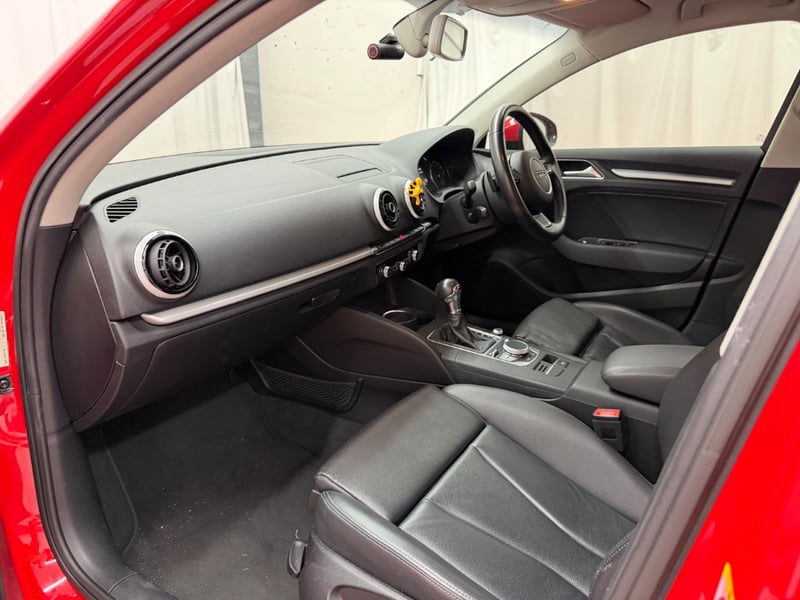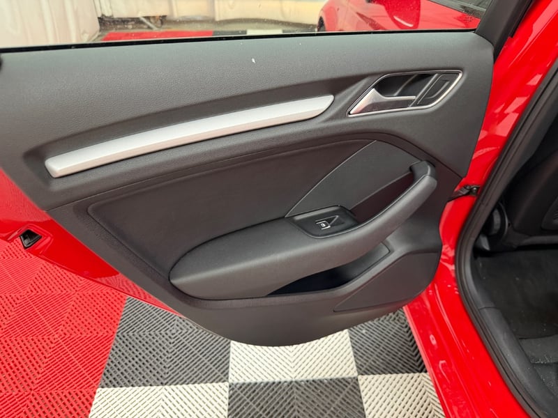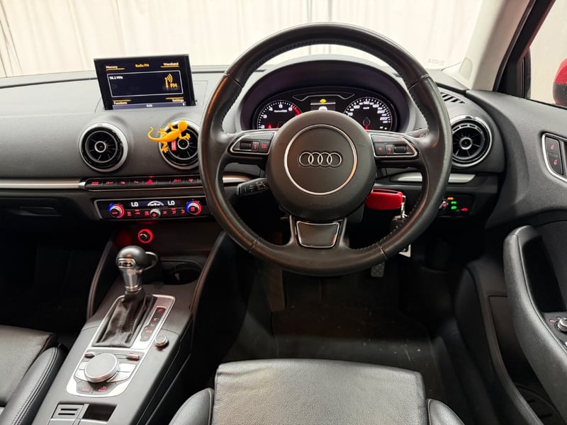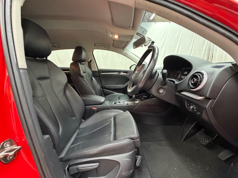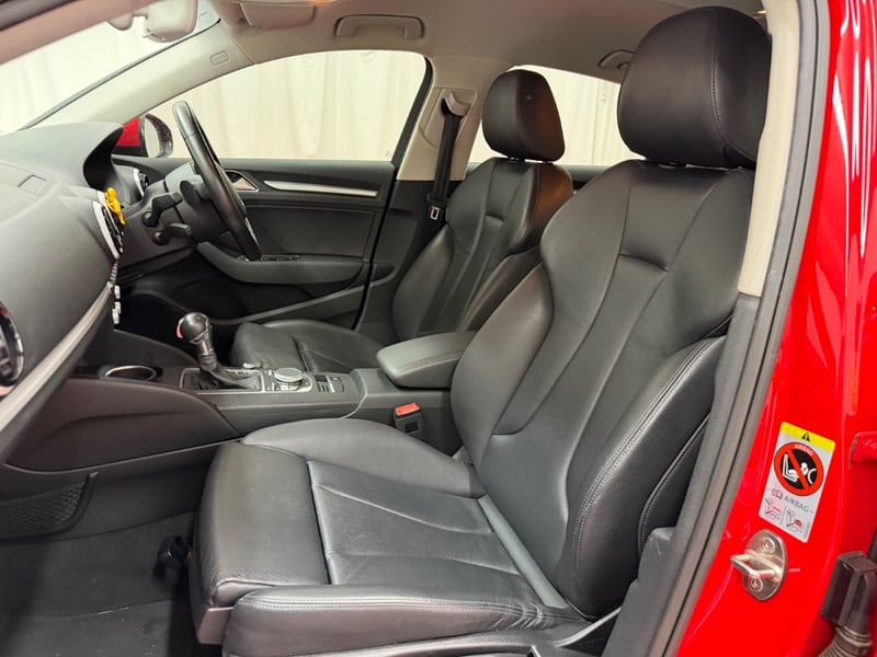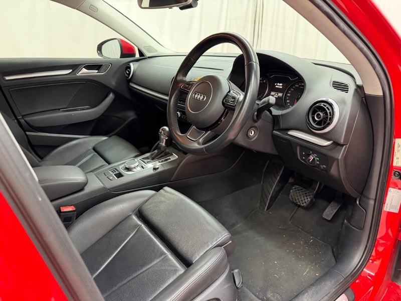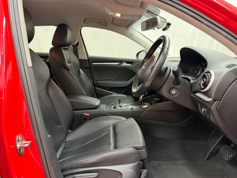 Description/extras: Audi A3 Sedan in Dynamic Red, manufactured November 2015. This turbocharged petrol sedan features a 1.8-litre inline 4-cylinder engine paired with a responsive 7-speed automatic transmission. The odometer reads 123,677 kilometres, indicating moderate usage. The vehicle presents with a professional specification including distinctive mesh alloy wheels with red lug nuts, premium leather upholstery throughout the cabin. Climate control is visible via dual-zone air conditioning controls, and an integrated MMI touchscreen display with satellite navigation enhances the driving experience. Front wheel drive provides assured handling characteristics whilst the spacious interior accommodates five passengers comfortably. This variant represents the pinnacle of compact performance engineering, combining everyday practicality with spirited driving dynamics. Service records up to 120,000 kms Minor surface wear visible on alloy wheels, light scuffing on lower door panels, minor cosmetic blemishes on bonnet and roof, Inspection recommended.