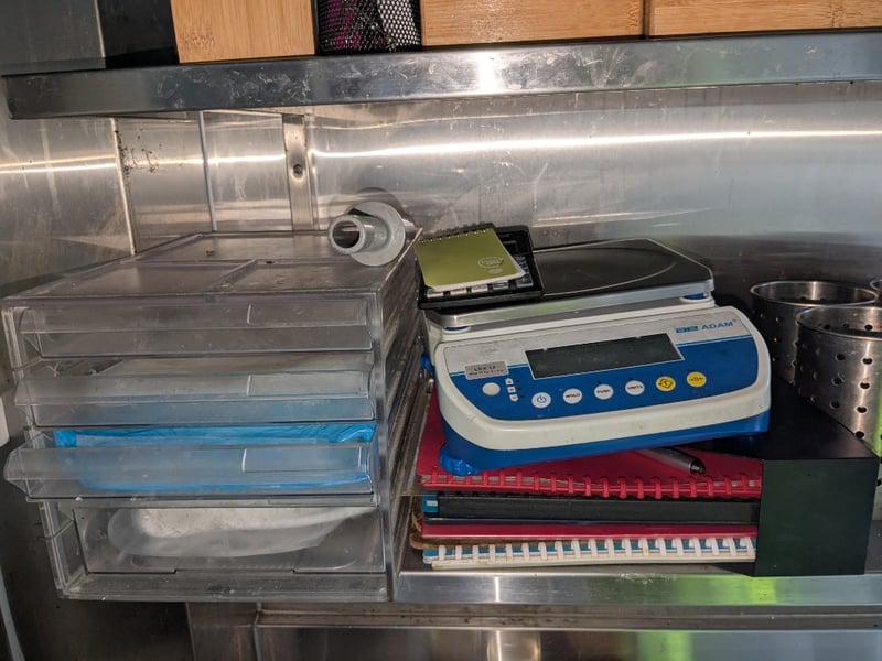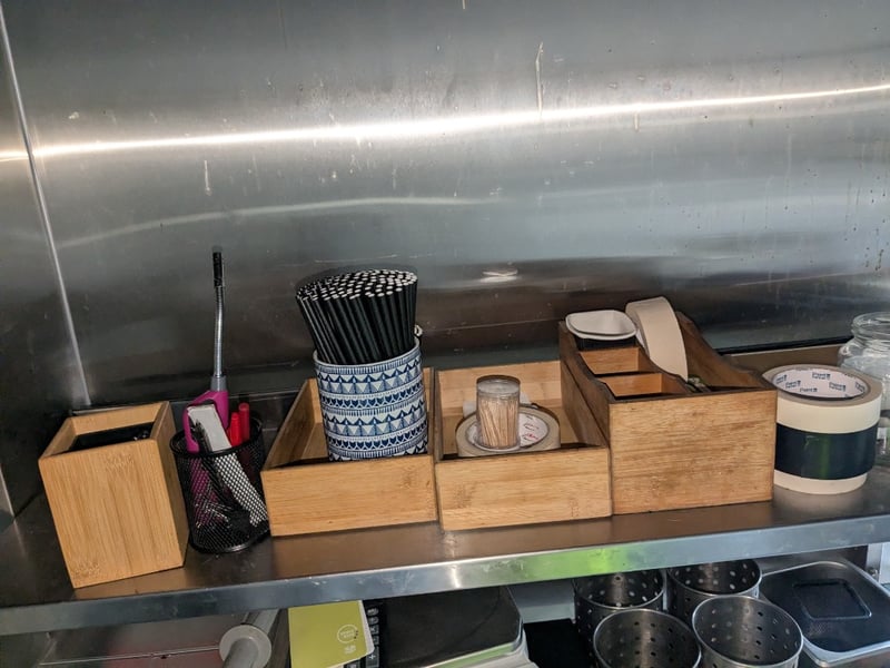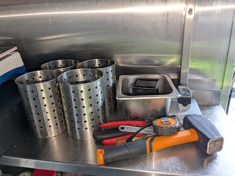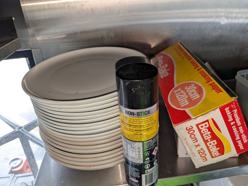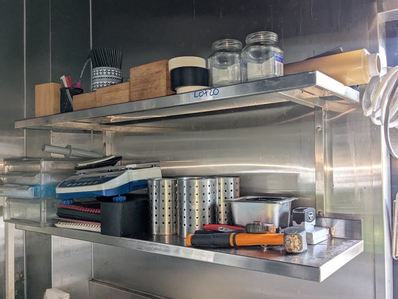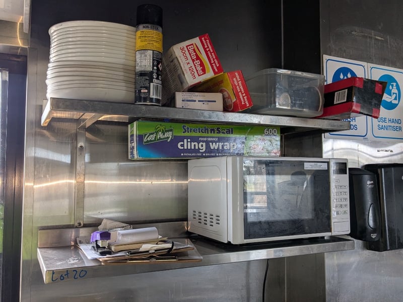 Shelves & Contents, Quantity x 6, Various Length, Stainless Shelves, Contents Include Plates, Bowls, Microwave, Scales, Plus More