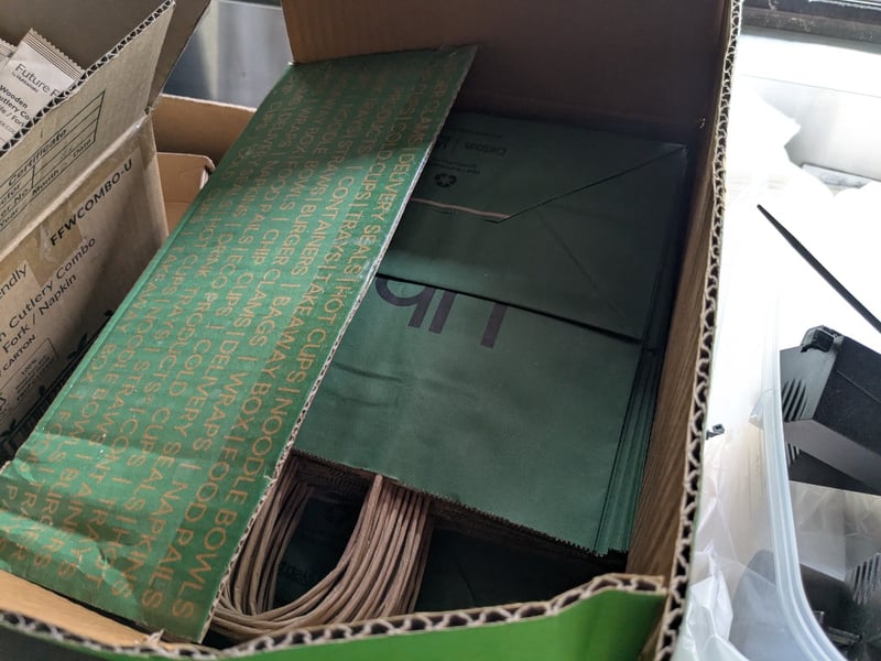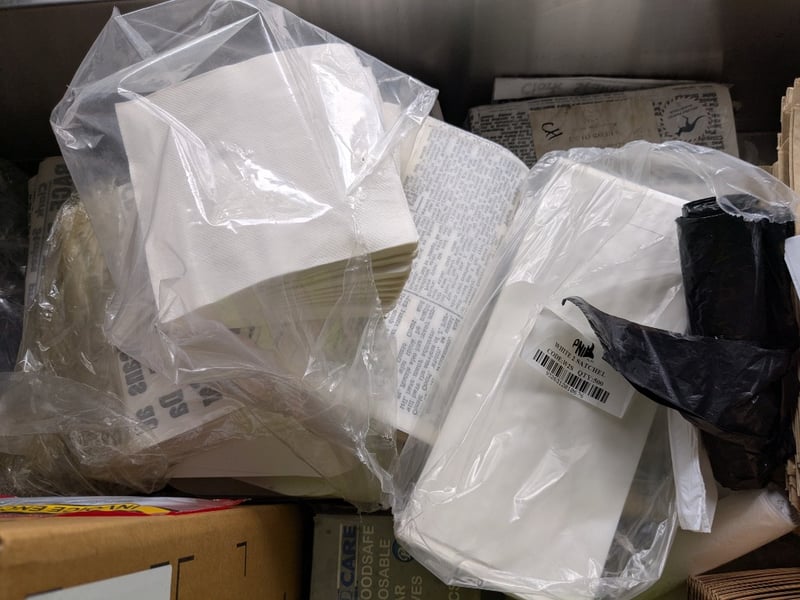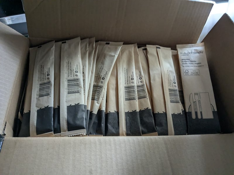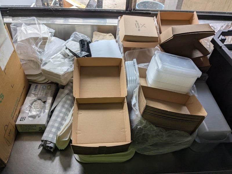 Takeaway Containers, Various Styles And Sizes, Wooden Cutlery, Napkins, Plus More Sold As Lot