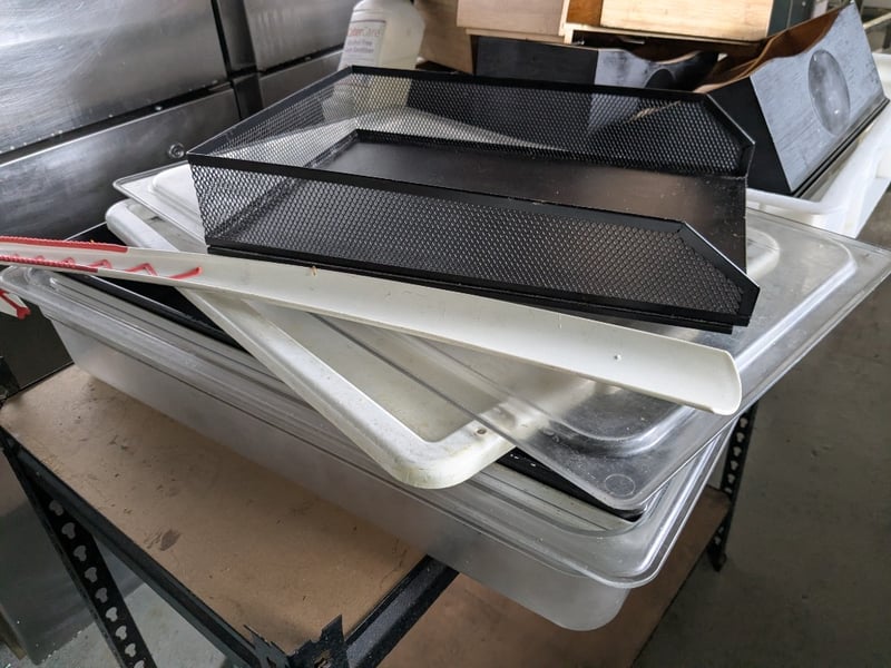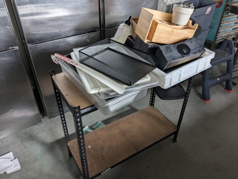 Stainless Tray Rack On Castors, Includes Various Miscellaneous Items And 1 x Stainless Stand