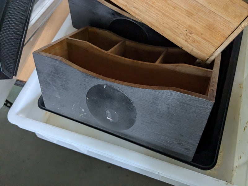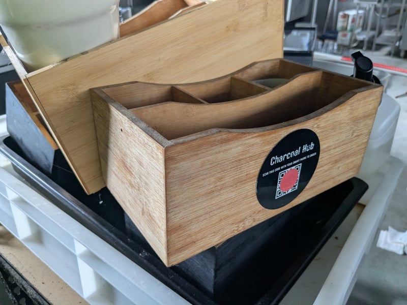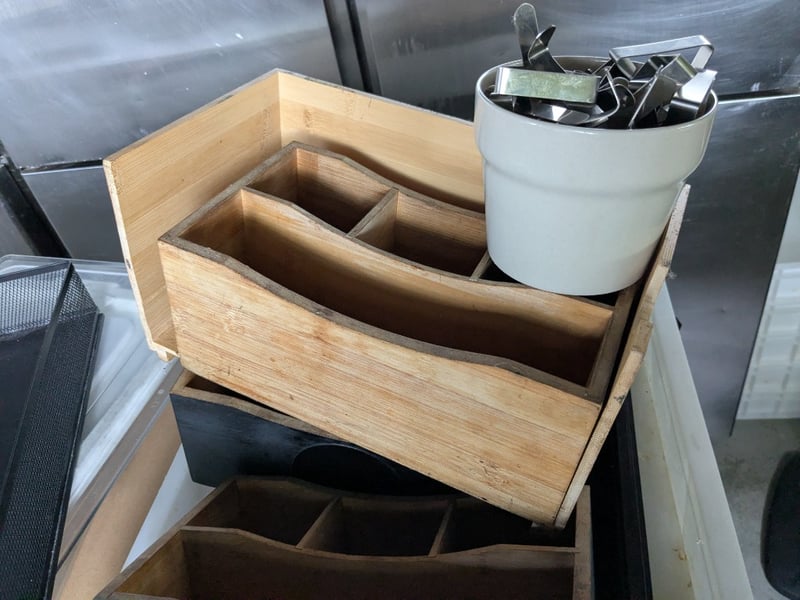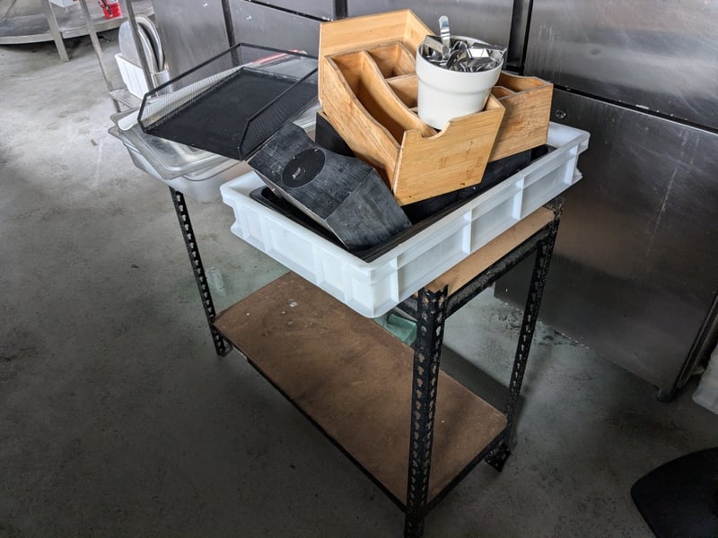 2- Tier Workshop Shelving, Includes Wooden Cutlery Hokders Amd Various Plastic Containers