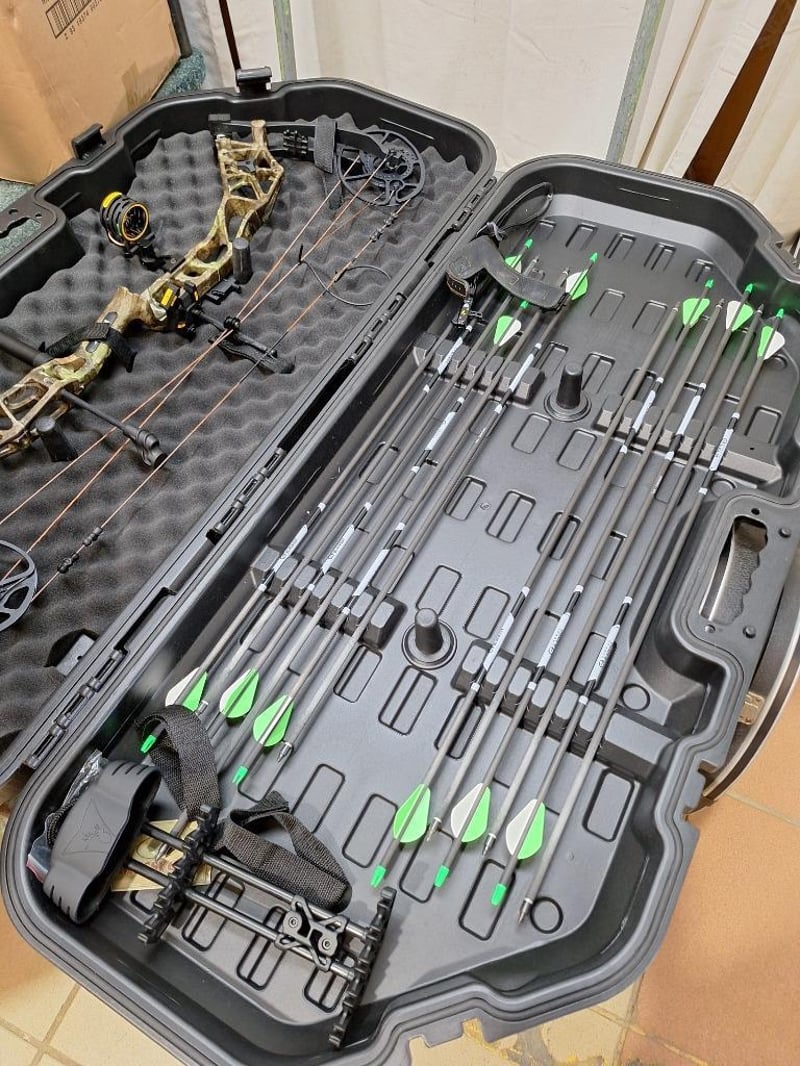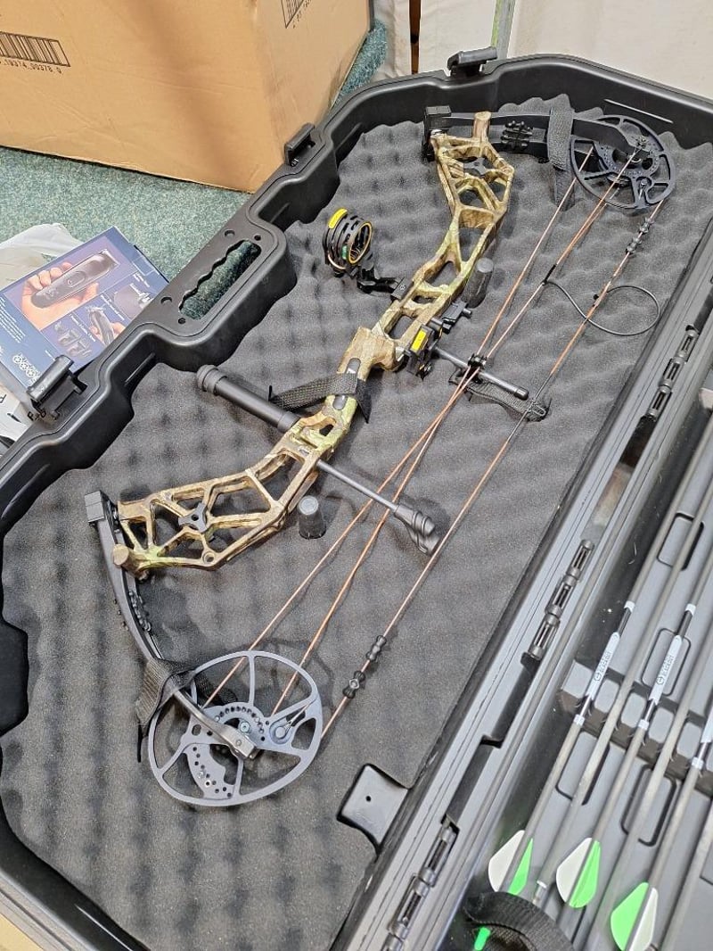 1x BEAR ARCHERY legit compound bow, 1x TROPHY RIGDE 5-spot arrow quiver, 12x carbon blackout original-350 arrow, 1x Trophy ridge drawpoint hook release, 1x Trophy Ridge whisker biscuit v-con arrow set, 1x hard case cover, new in box Due to the nature of the item, customer must be 18+ and will be requested to show ID upon collection