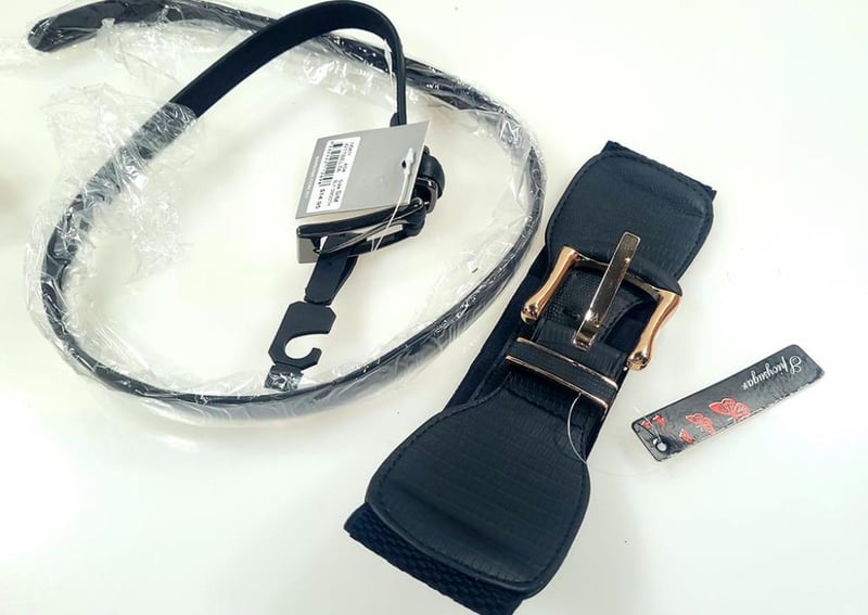 Ladies fashion belts bulk buy - 2 styles. 65 belts in total - 25 x Spicy Sugar black wide elastic belts and 40 x Barkin Accesories narrow black belts (RRP price on tags shows $14.95 each).