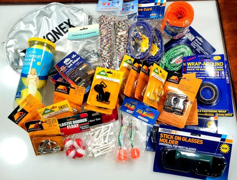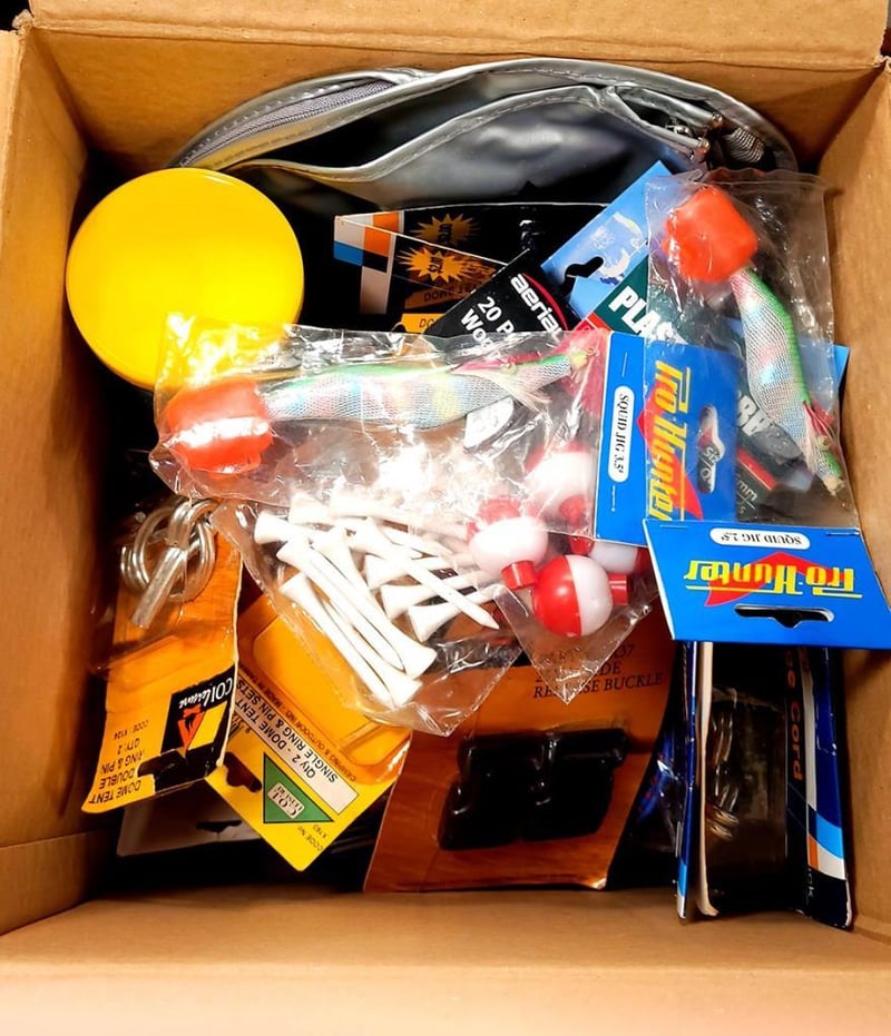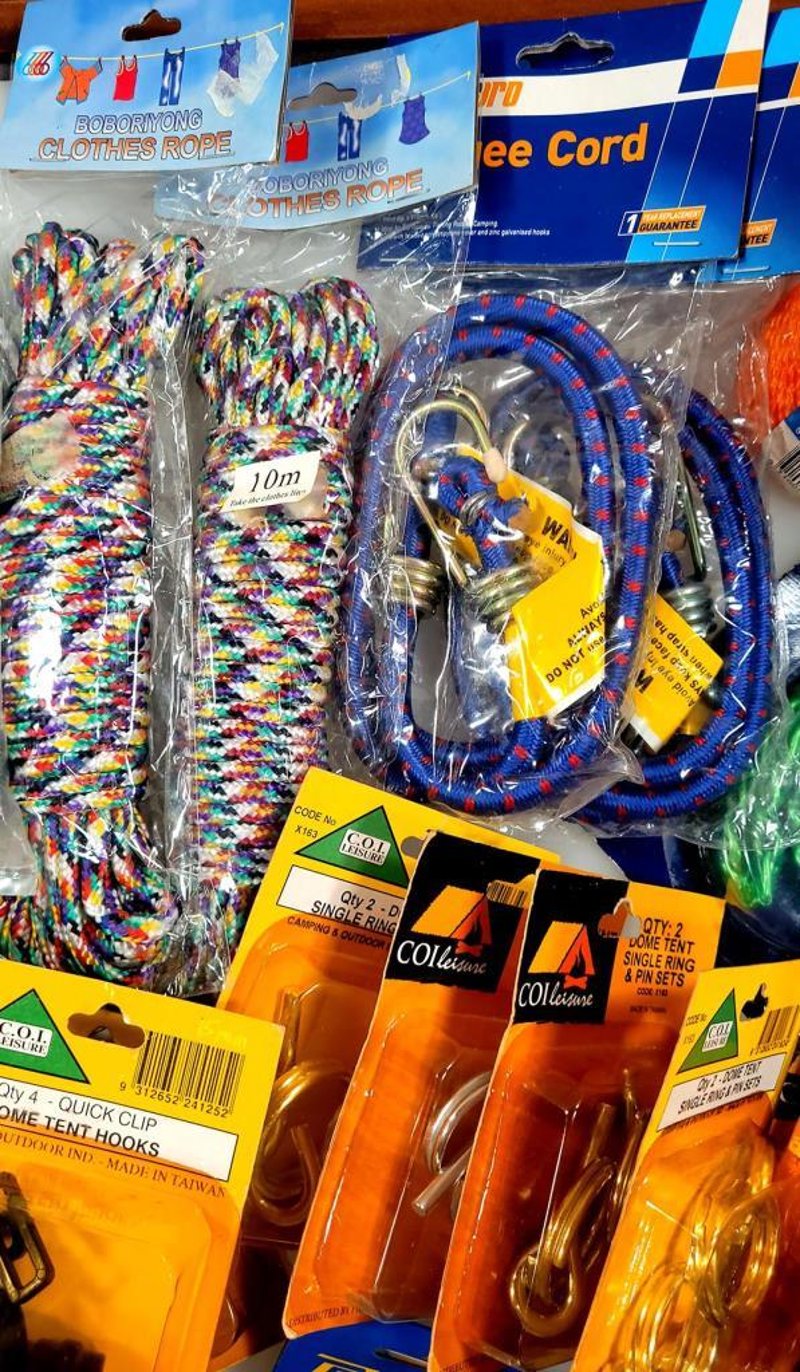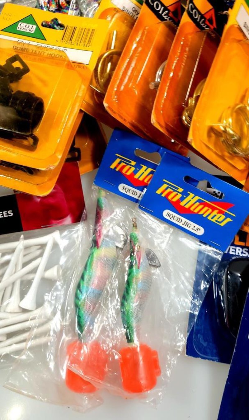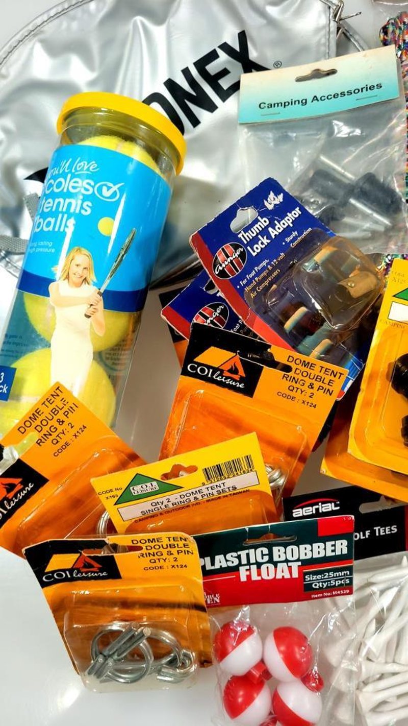 Box of Various Camping and Sporting Items.Loads of useful goodies! Box of assorted items for camping and sports including ropes, bungy cords, bike combination lock, tennis balls, squash racquet covers, golf tees, fishing floats, squid jigs, wrap around tapes, glasses holders, single and double dome tent rings & pin fittings and more!All new (old stock) in original packs. Some of the clear packaging has yellowed, but the items inside are all good. Please see pics.