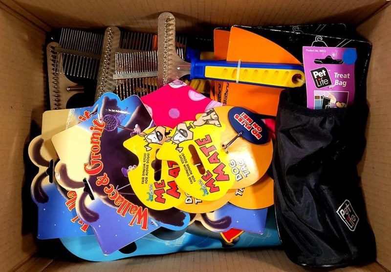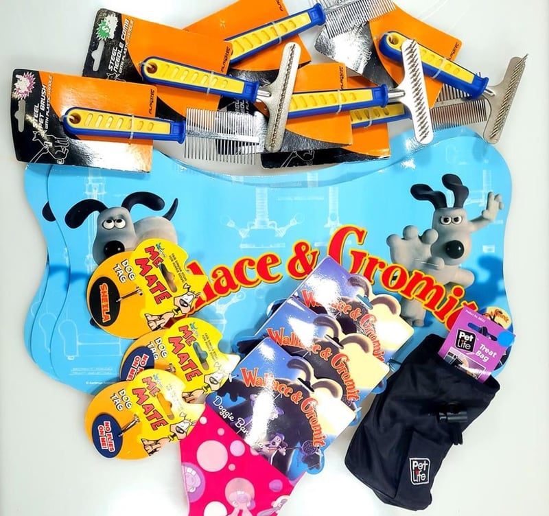 Mixed box of goodies for dogs including Wallace & Gromit vinyl feeding mats (a little bit crinkled from being rolled up), Wallace & Gromit doggie bandanas, a treat bag, dog tags and various combs. All NEW with tags.