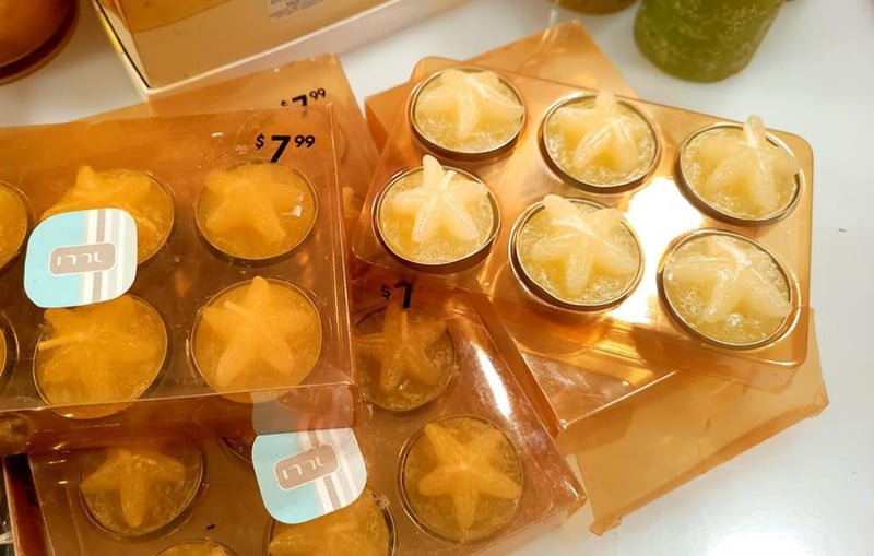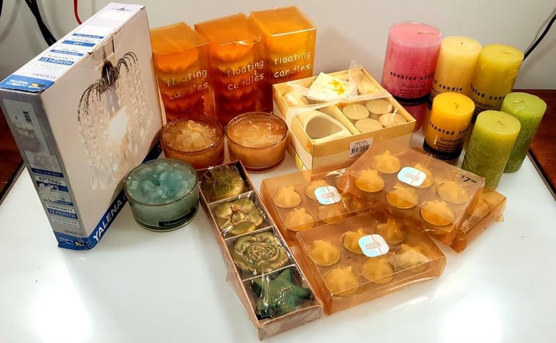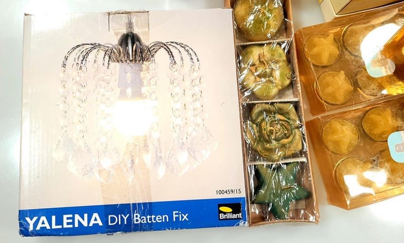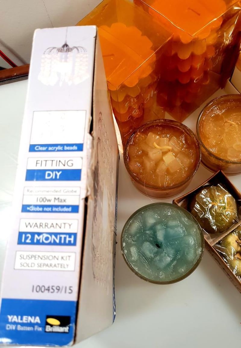 Box of assorted candles: 3 x packs of 5 floating candles, 4x packs of 6 starfish tealights (RRP $7.99 each), a gift boxed scented oil burner, 4 x scented pillar candles and various others as shown. Also included is a DIY batten fitting candelabra style light fitting.