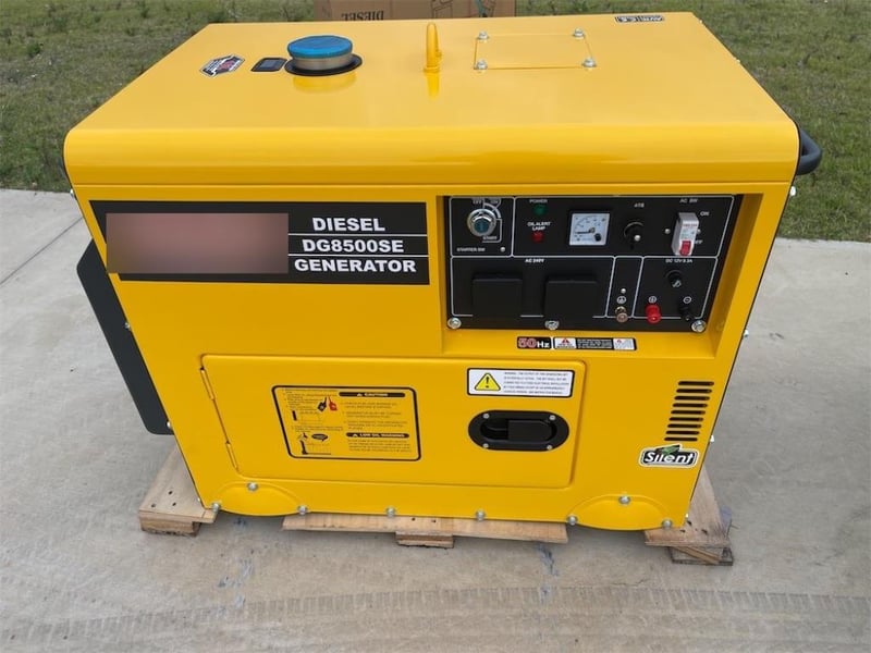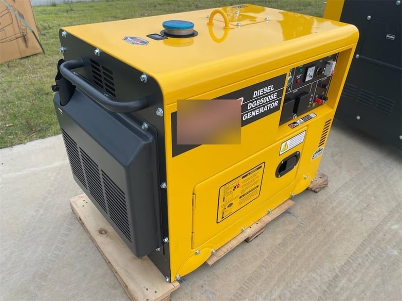 Unused 6kW Silenced Diesel Engine Generator, Model: DG8500SE, Air-Cooled Diesel Engine, Silenced Cabinet, 240V Outlets, Key Start, 50 Hz, Rated AC Output: 6kW, Rated Current: 25A, Approximate Shipping Dimensions: 935mm L x 535 mm L x 680mm H, Approximate Weight: 160kg