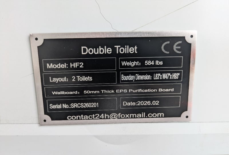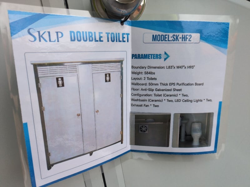 FACTORY DIRECT ** Unused 2025 SKLP SK-HF2, Double Portable ToiletLayout:2 Toilets Configuration:Toilet (Ceramic) * Two, Washbasin (Ceramic) * Two, LED Ceiling Lights * Two, Exhaust Fan * TwoPlease note: minor scuffs and marks may be evident For more information Contact King Cheung on 0477987576 or [email protected] *** PLEASE NOTE Collections must occur within 7 days of Auction Ending*** Note: OEM images and VIDEOS shown are for illustration purposes only, and used as a guide only, inspections highly recommended. DFCU1693128