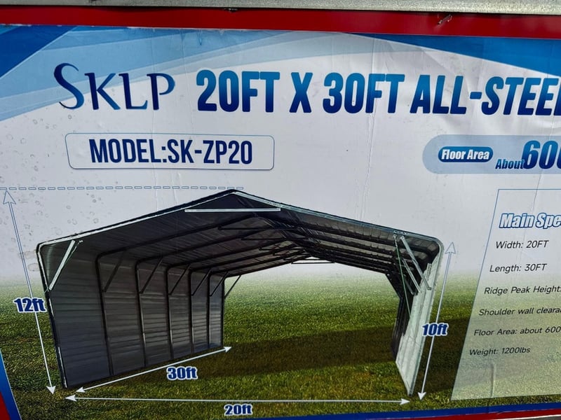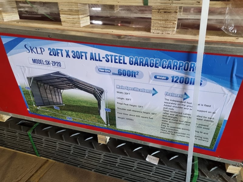 FACTORY DIRECT ** Unused 2025 SK-ZP20, All-Steel Garage Carport 2025 SK-ZP20, All-Steel Garage Carport Width: 20FT Length: 30FT Ridge Peak Height: 12FT Shoulder wall clearance height: 10FT Floor Area: about 600 square feet Weight: 1200lbs Pack Size Approx: Wooden box: 1 box only 105cm x 215 cm x 60cm For more information Contact King Cheung on 0477987576 or [email protected] *** PLEASE NOTE Collections must occur within 7 days of Auction Ending*** Note: OEM images and VIDEOS shown are for illustration purposes only, and used as a guide only, inspections highly recommended. DFCU1693128