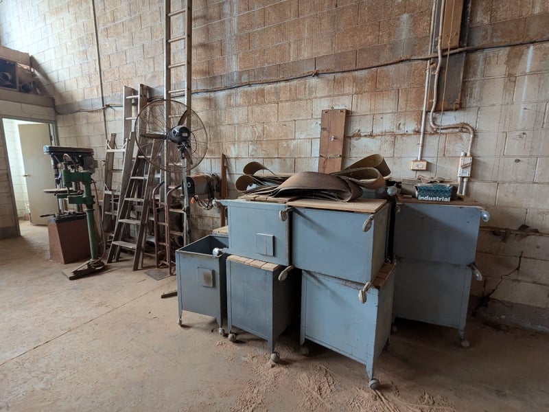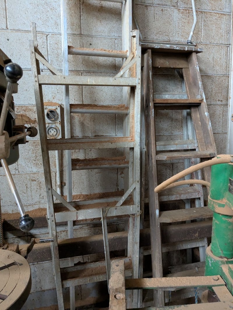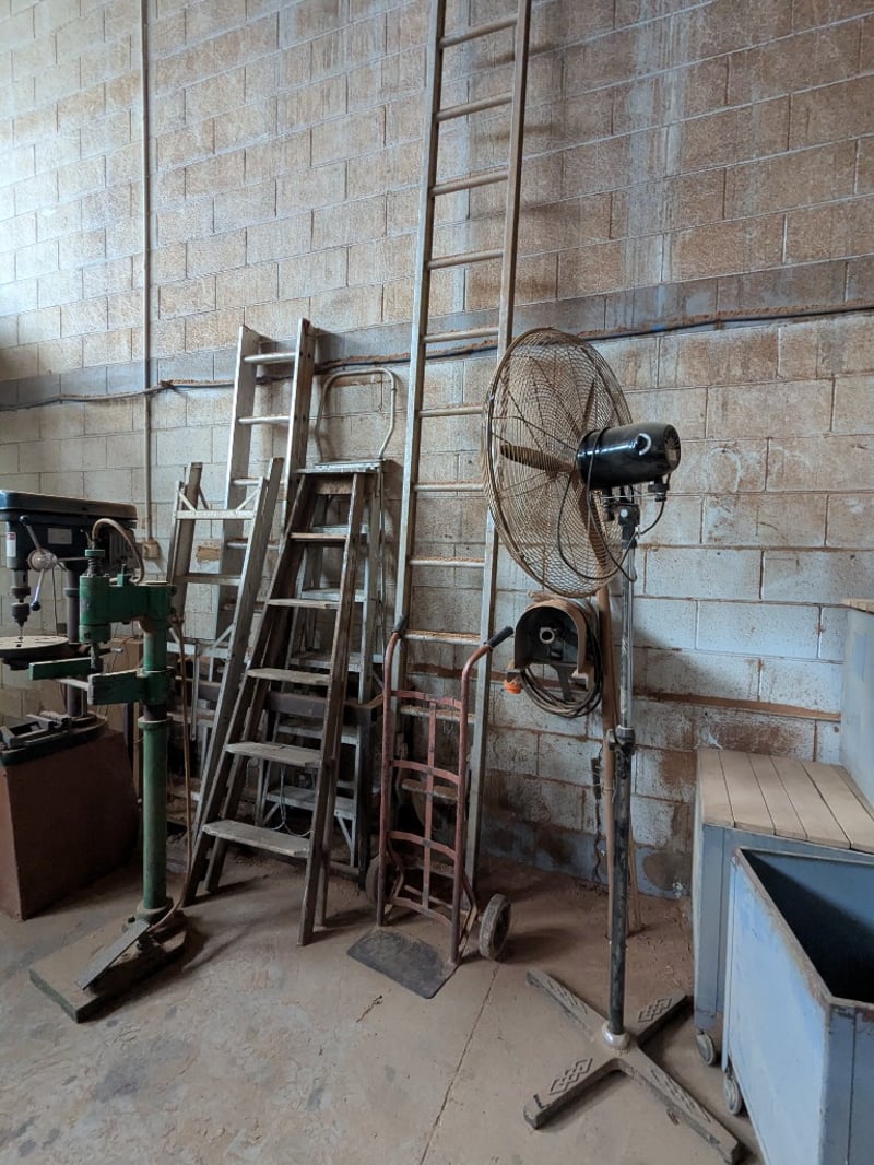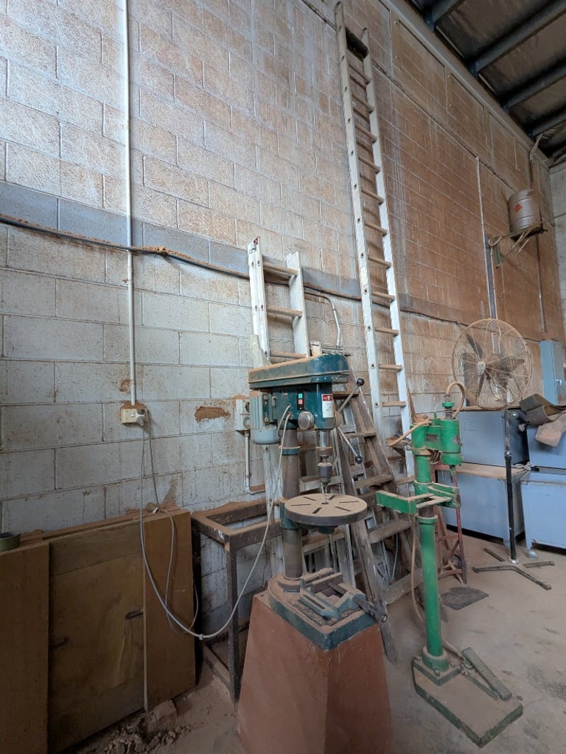 Assorted items including, Tengxian machine tool factory model: LT-138-N, assorted ladders various heights, lengths and sizes, pillar drill press and more..