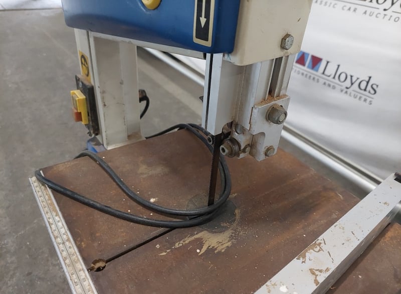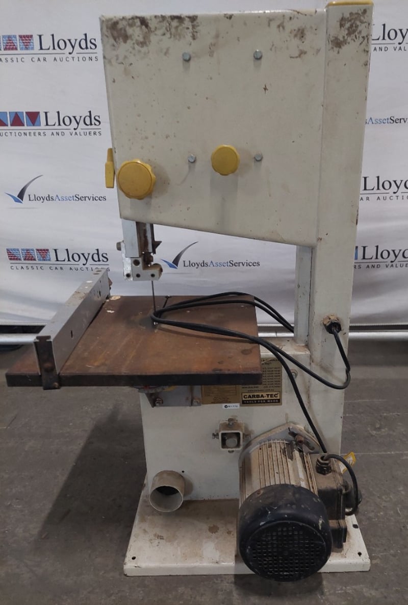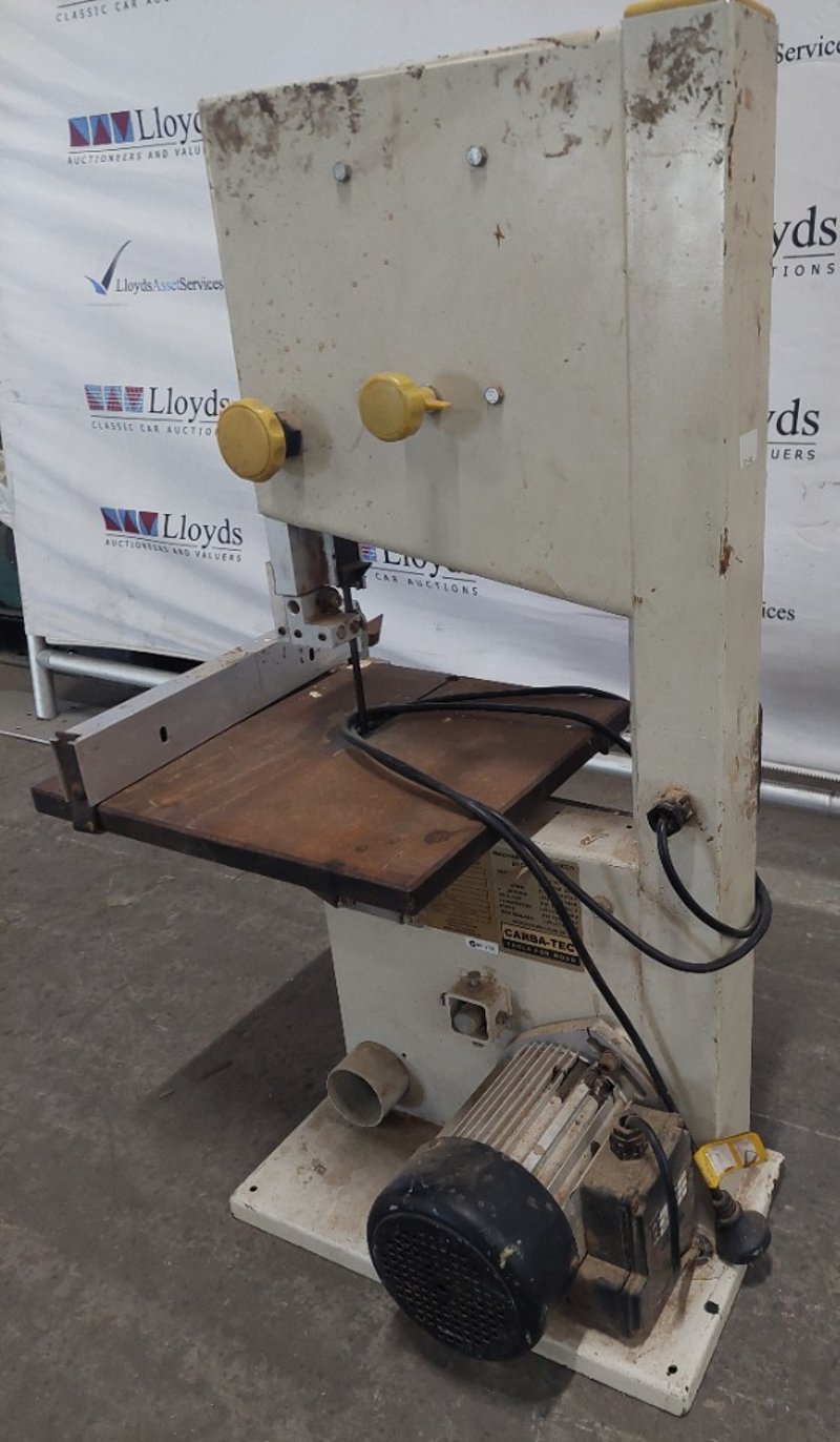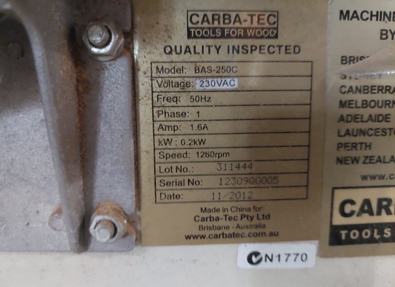 Carba-Tec bandsaw. Model: BAS-250C Serial number: 1230900005 Dims:82cm H, 50cm L, 33cm W Note: item is untested, signs of wear.