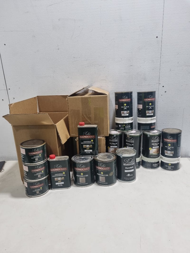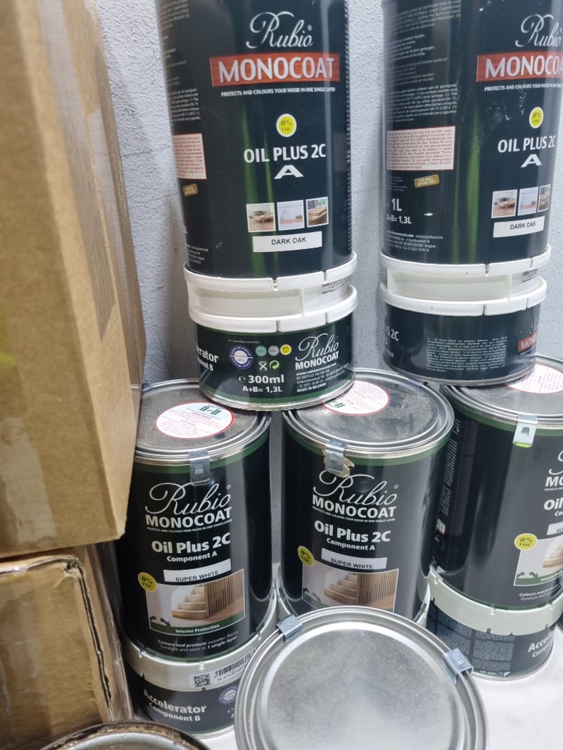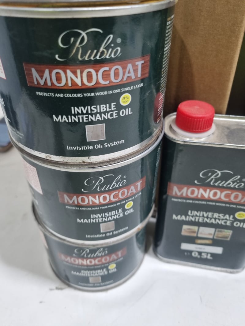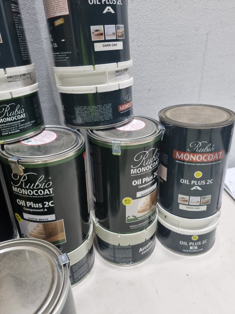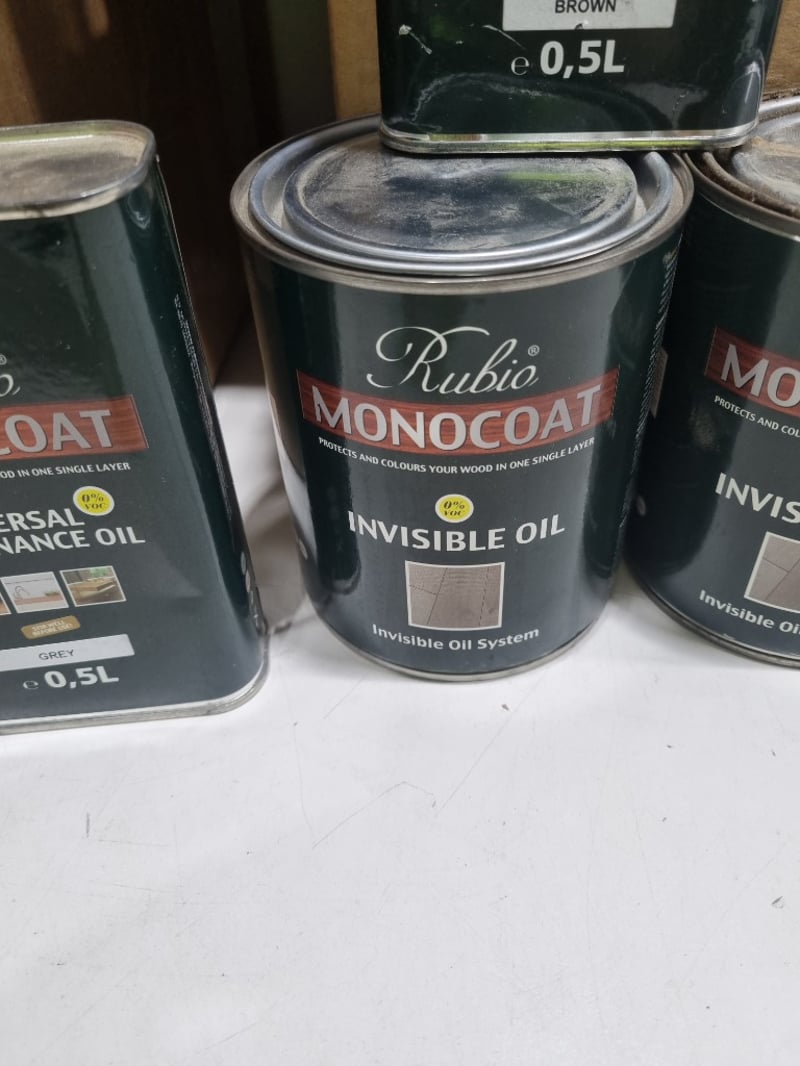 Assorted monocoats, assorted colours,Rubio brand,and more.. .