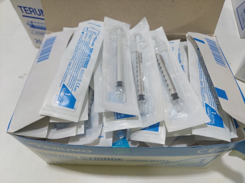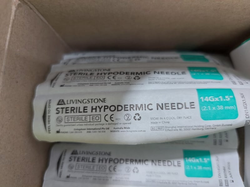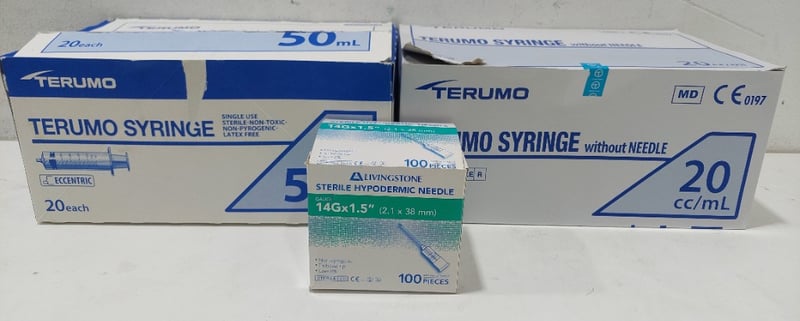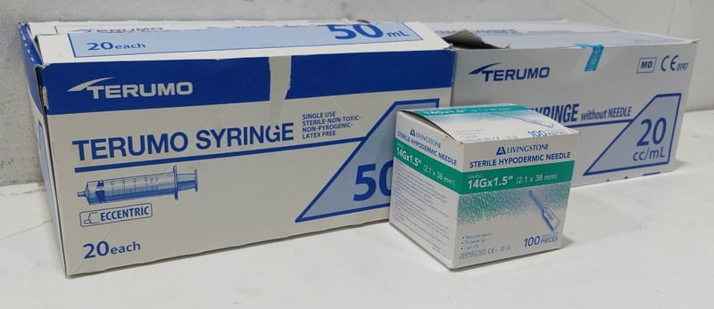 Assorted lot includes, Syringe without needle Terumo,Various sizes and Sterile hypodermic needles Livingstone. Sold as a lot. Notes: items untested and signs of wear.