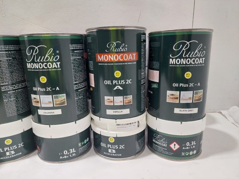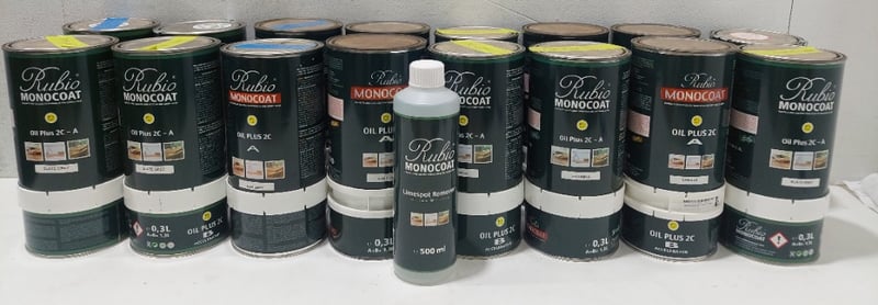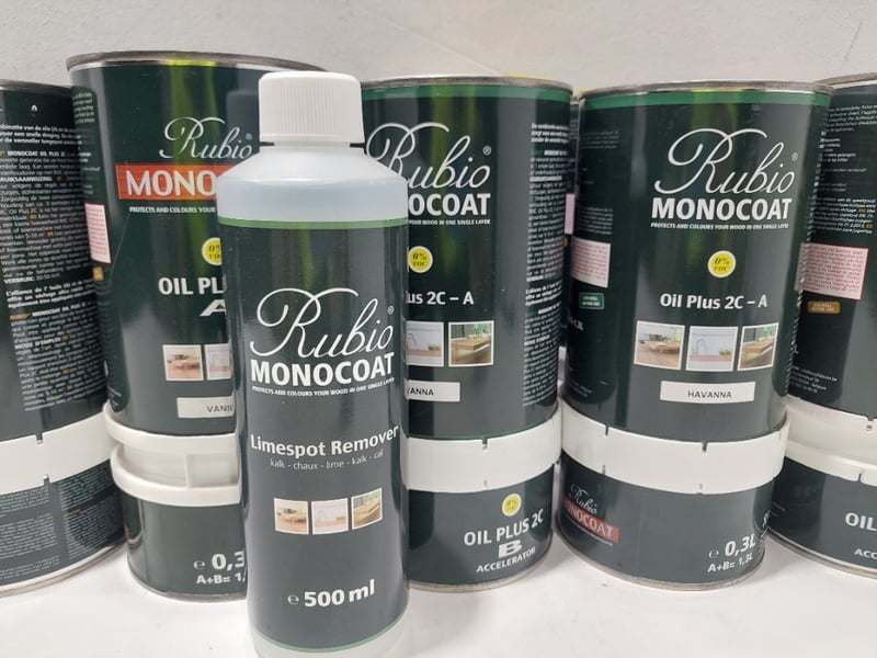 Oil plus 2C Rubio, various colours, limespot remover Rubio. Sold as lot. Notes: signs of wear.