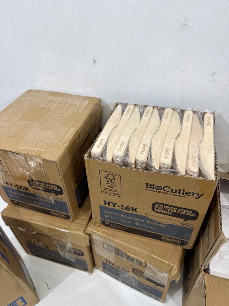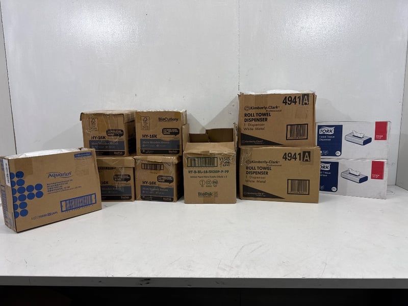 Cutlery/ Dispensers, Assorted Brands including Bio Cutlery, Bio Pak, Kimberly-Clark and Tork. Items include Mini Folded Towel Dispenser, Roll Towel Dispenser, Facial Tissue Dispenser, 500ml Plant Fibre Bowls and 16cm Wooden Knives.