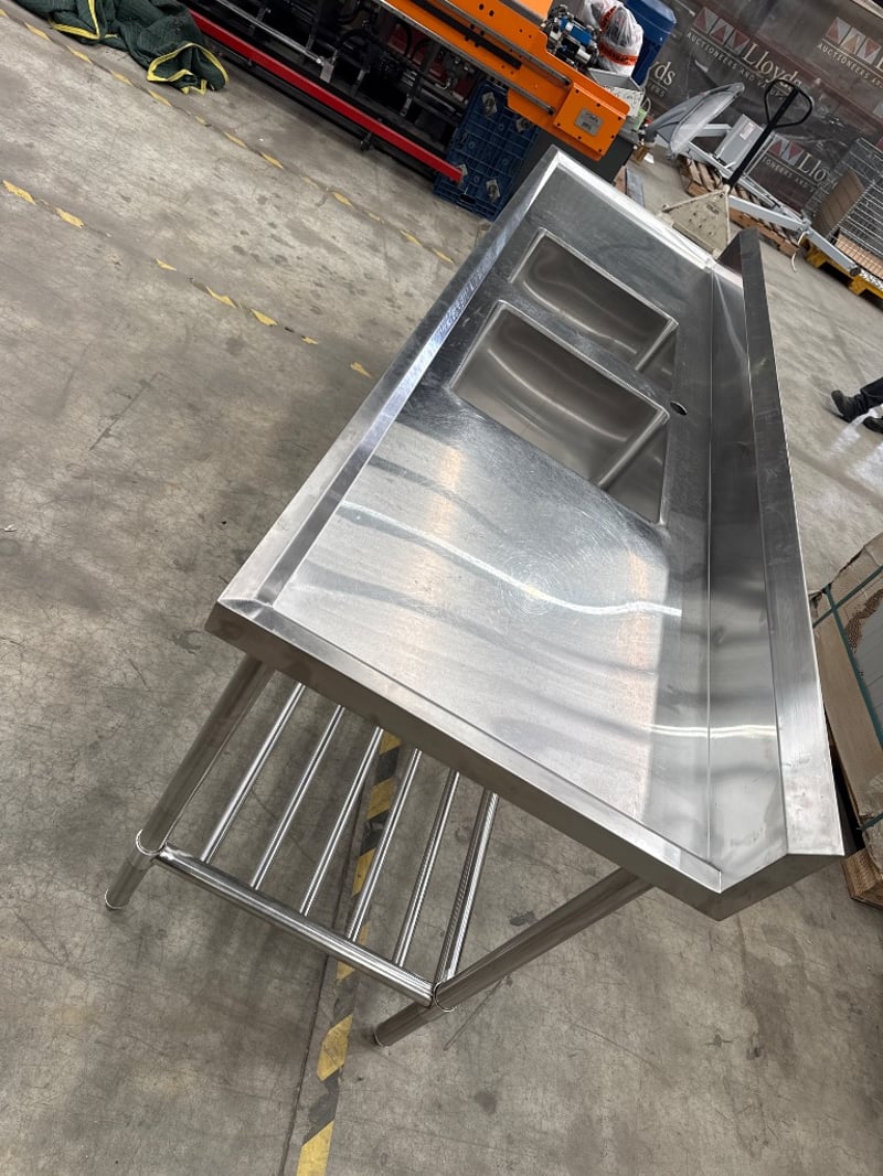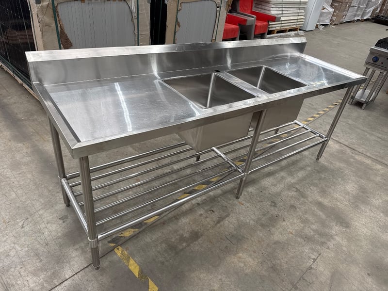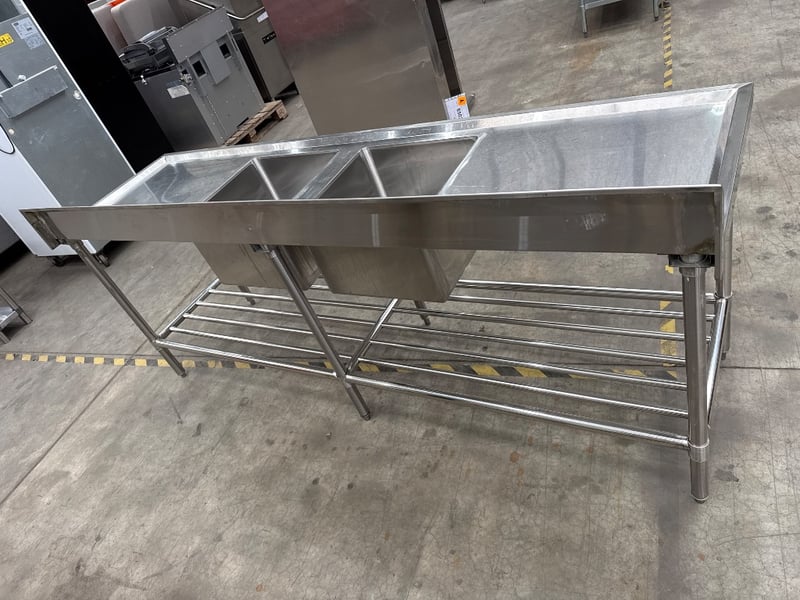 Bench with 2 sinks, Stainless Steel, With Splashback, Freestanding, no data plate. Approx dimensions- 240w x 70d x 105h