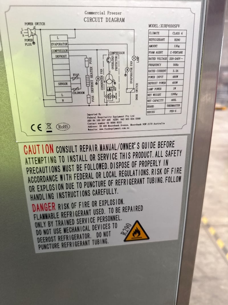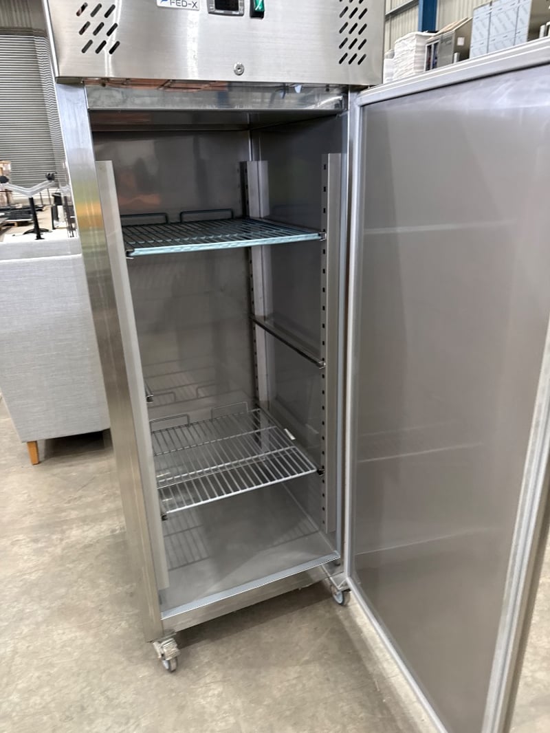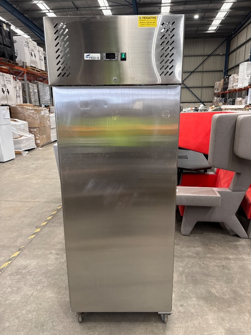 Fridge, FED-X, XURF650SFV, serial - 6877 1420 2203 0203, 10 amp, upright, solid door, stainless steel.Approx dimensions: 74w X 83d X 200h.