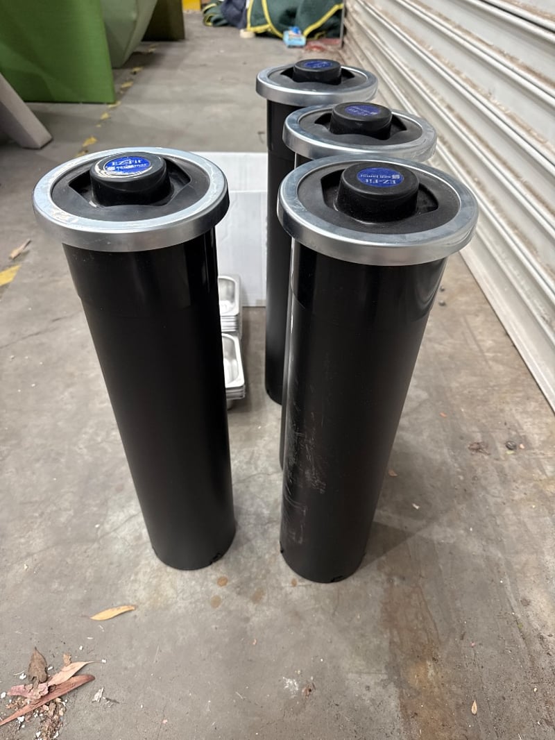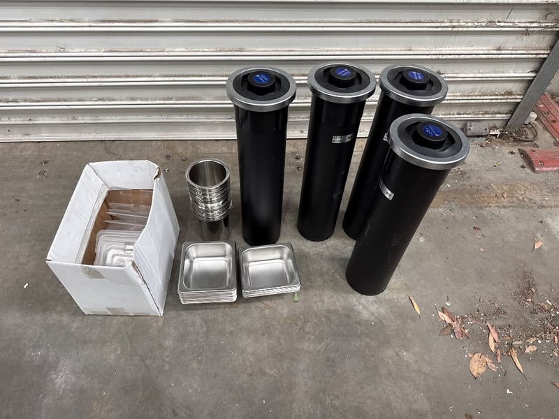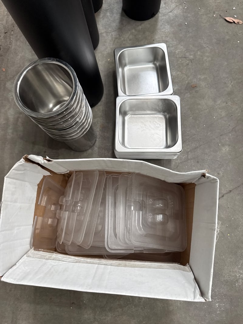 Assorted catering equipment, items include: 24x GN pans + lids, 4x San Jamar EZ-FIT CUP Dispensers, 9x stainless steel canisters smallwares,