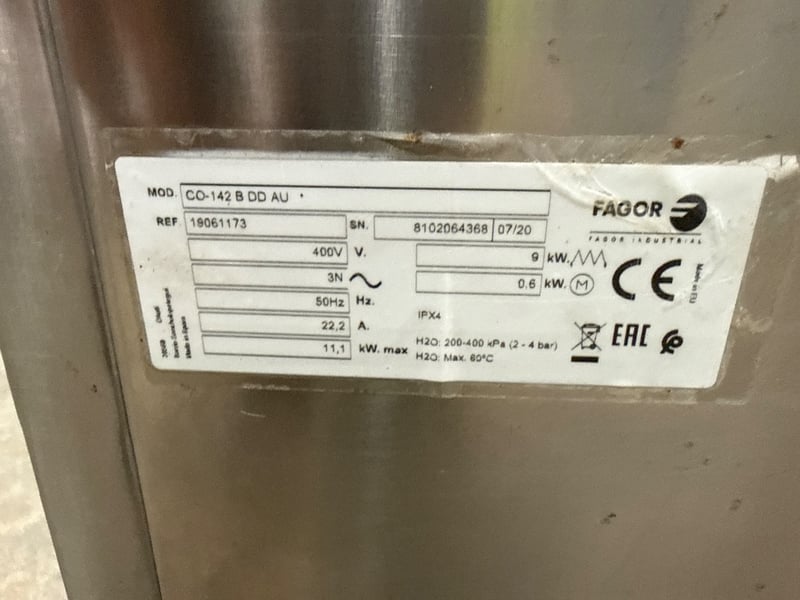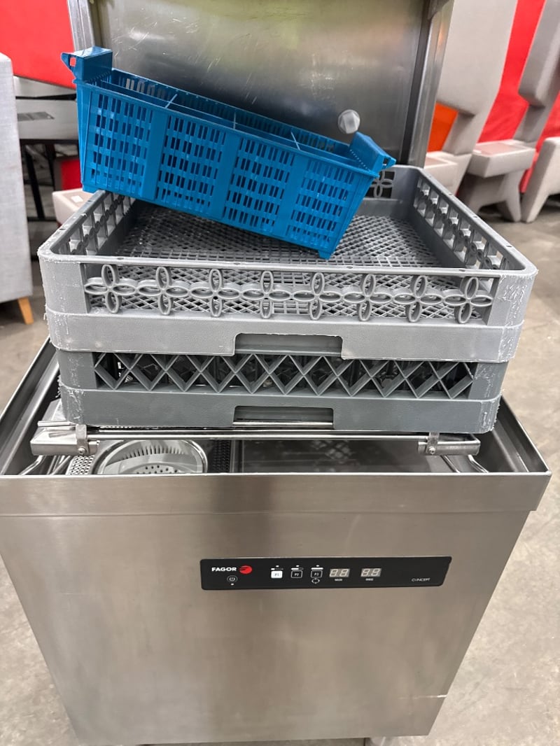 Dishwasher, laundry pass-through, Fagor, 3 phase HW, stainless steel.Approx dimensions: 71w X 82.5d X 150h.
