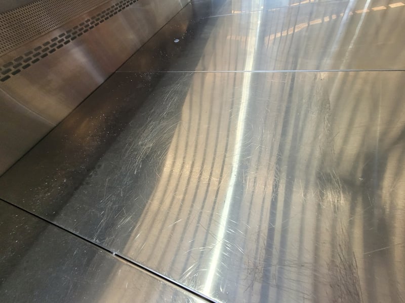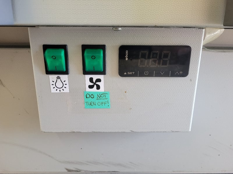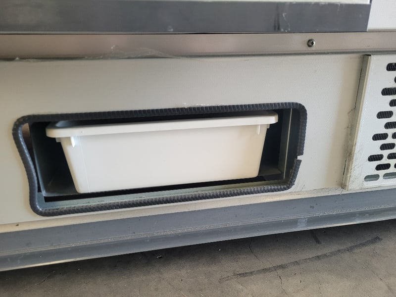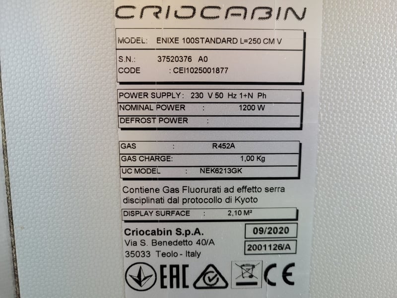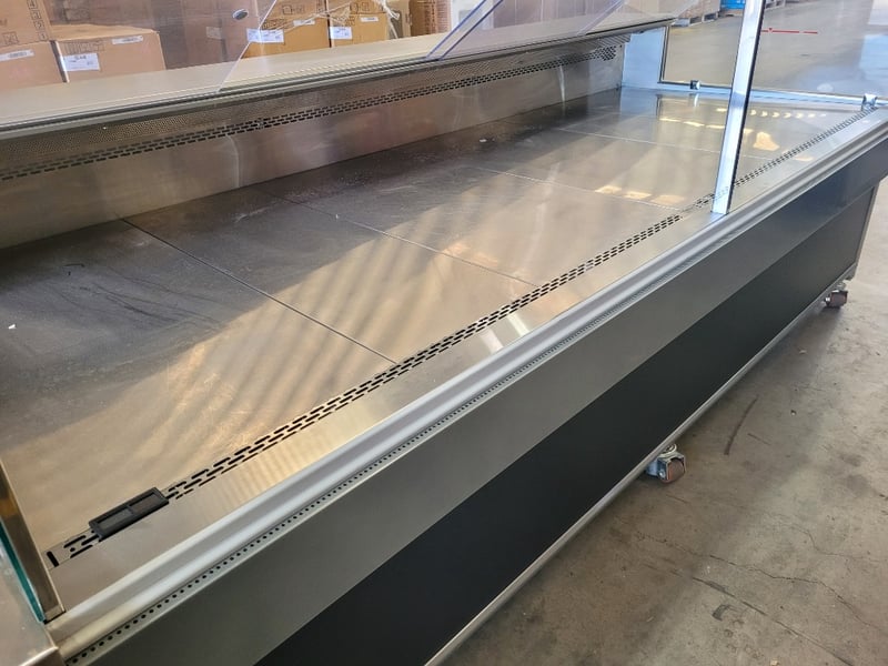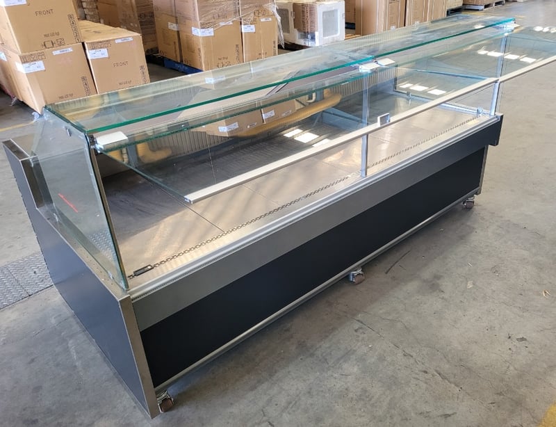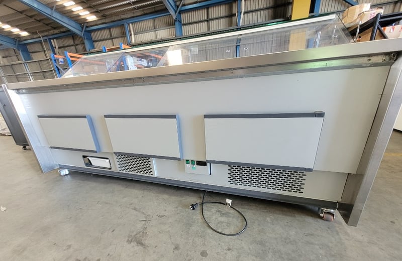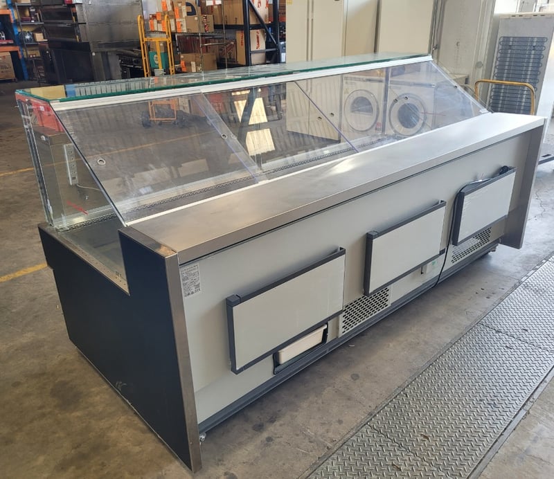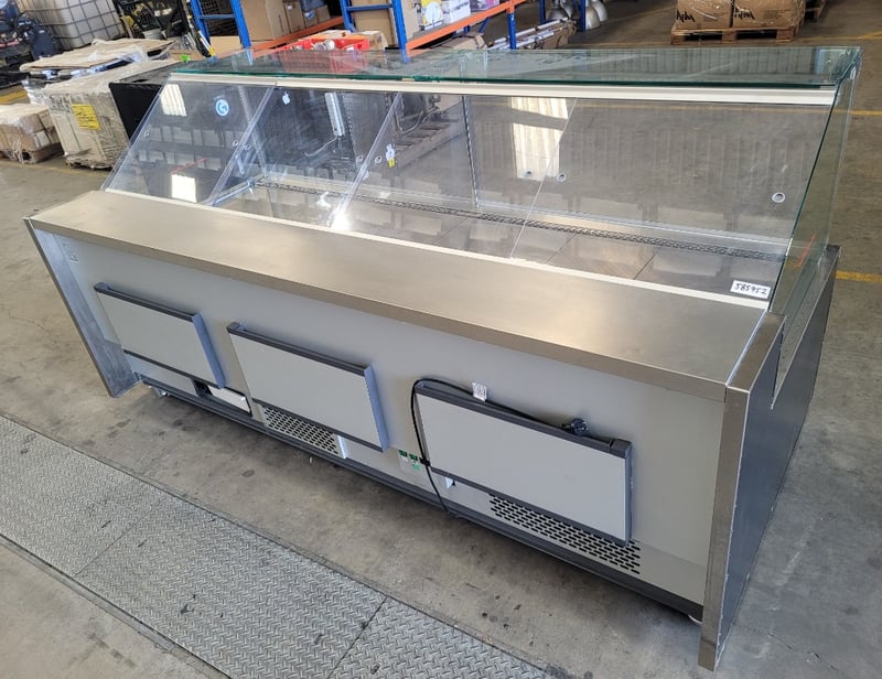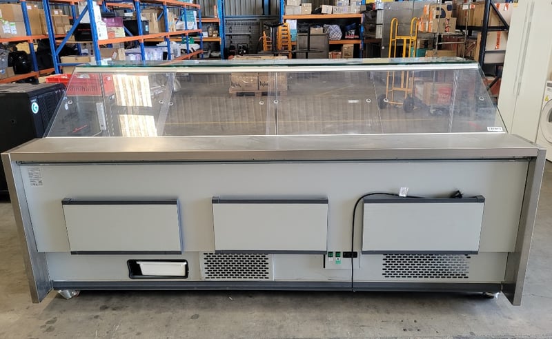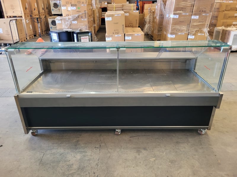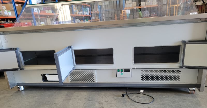 Description: Refrigerated Lounge Deli display cabinet, glass top, front and rear access doors, on castor wheels, LED lighting, approximate dimensions length 2600mm x width 1200mm x height 1270mm weight 280kg. Note untested inspection recommended, minor marks and wear.