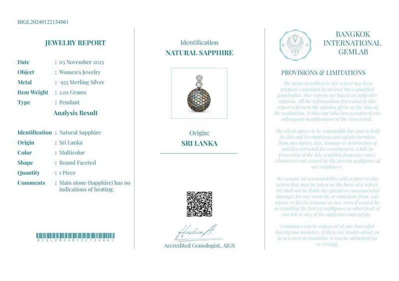 NATURAL SRI LANKAN SAPPHIRE PENDANT ON 925 SILVER - WITH CERTIFICATE Gemstone : Natural Sri Lankan SapphireCertificate Number : Bigl20240122134061Item Total Weight : 2.01 GramsGemstone Color : MulticolorShape : Round FacetedMeasurement/Size : N/AComments : Main Stone (Sapphire) Has No Indications Of Heating. ✻ Verify Report Online At Www.Bangkokinternationalgemlab.Co Condition: Good - Refer Images 01611172+25