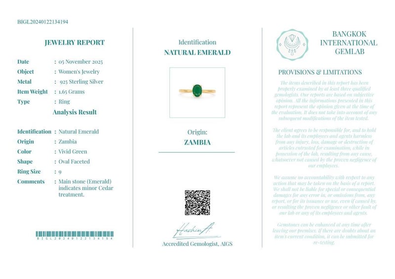 Comments : Main Stone (Emerald) Indicates Minor Cedar Treatment.