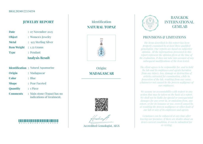 NATURAL TOPAZ PENDANT ON 925 SILVER - WITH CERTIFICATE Gemstone : Natural TopazCertificate Number : Bigl20240122134354Item Total Weight : 1.35 GramsGemstone Color : BlueShape : Pear FacetedMeasurement/Size : N/AComments : Main Stone (Topaz) Has No Indications Of Treatment. ✻ Verify Report Online At Www.Bangkokinternationalgemlab.Co Condition: Good - Refer Images 01611172+38