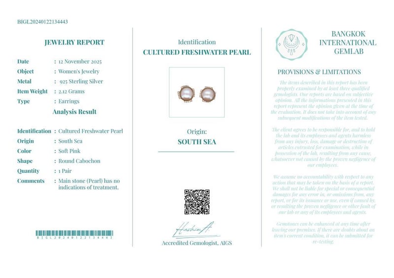 SOUTH SEA PEARL EARRINGS ON 925 SILVER - WITH CERTIFICATE Gemstone : South Sea PearlCertificate Number : Bigl20240122134443Item Total Weight : 2.12 GramsGemstone Color : Soft PinkShape : Round CabochonMeasurement/Size : N/AComments : Main Stone (Pearl) Has No Indications Of Treatment. ✻ Verify Report Online At Www.Bangkokinternationalgemlab.Co Condition: Good - Refer Images 01611172+42