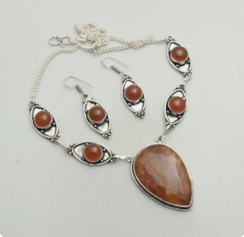 925 SILVER RED ADVENTURINE CARNELIAN NECKLACE EARRINGS SET