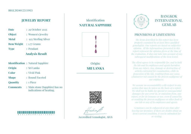 NATURAL SRI LANKAN SAPPHIRE PENDANT ON 925 SILVER - WITH CERTIFICATE Gemstone : Natural Sri Lankan SapphireCertificate Number : Bigl20240122133921Item Total Weight : 1.77 GramsGemstone Color : Vivid PinkShape : Round FacetedMeasurement/Size : N/AComments : Main Stone (Sapphire) Has No Indications Of Heating. ✻ Verify Report Online At Www.Bangkokinternationalgemlab.Co Condition: Good - Refer Images 01611165+19