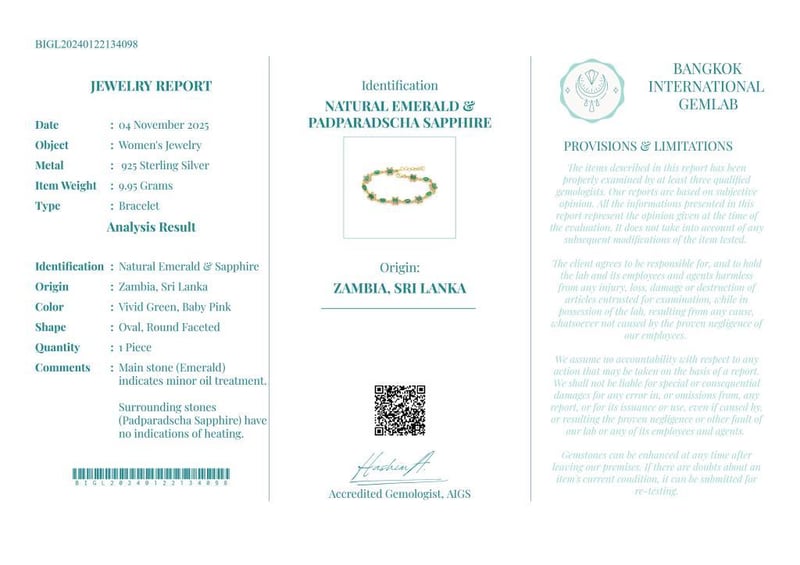 Comments : Main Stone (Emerald) Indicates Minor Oil Treatment.