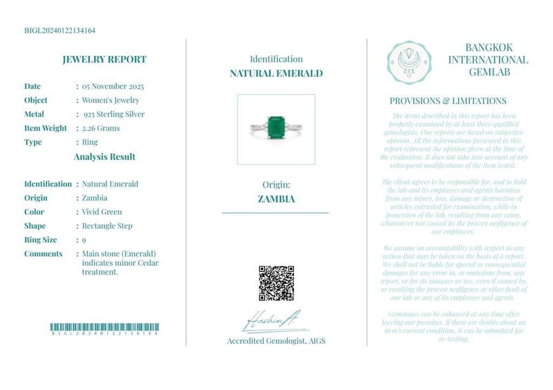 Comments : Main Stone (Emerald) Indicates Minor Cedar Treatment.