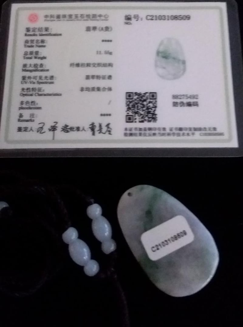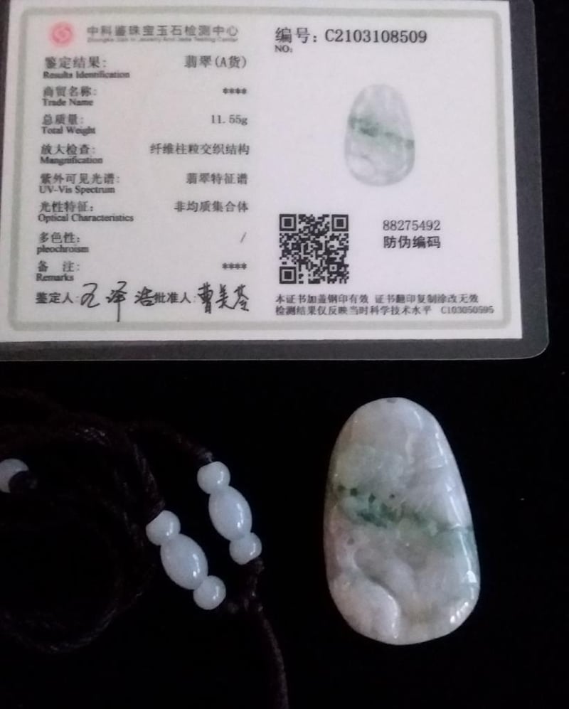 CERTIFIED CHINESE ICE GREEN JADE UNISEX NECKLACE AND PENDANT WITH CERTIFICATE