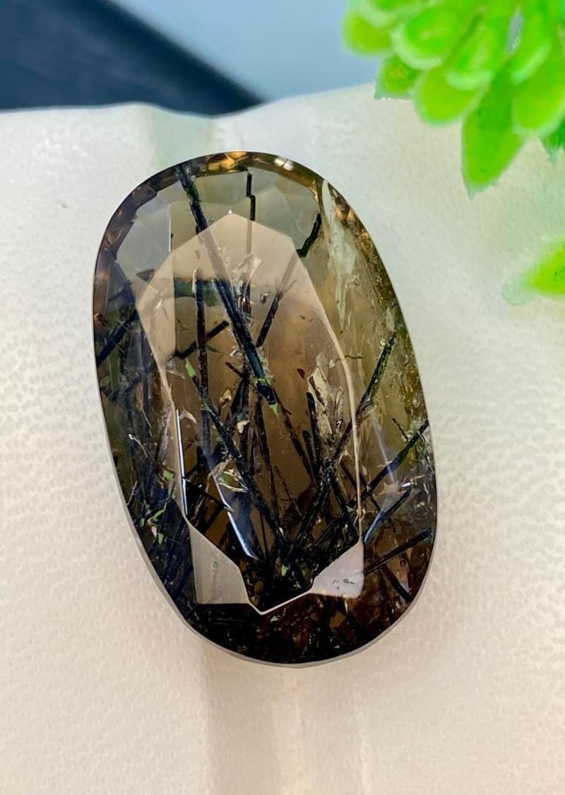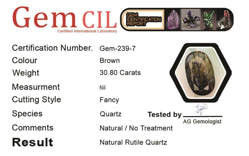 30.80 CARATS NATURAL RUTILE QUARTZ 30.80 Carats Natural Rutile QuartzStone = Natural KunziteWeight = 30.80 Carats Colour = Brown/Black NeedlesCut = Fancy Lustre = ExcellentNote = Gem Cil, Certified, Precise Custom Cut (Not Commercial) Condition: Good - Refer Images 0488465+7