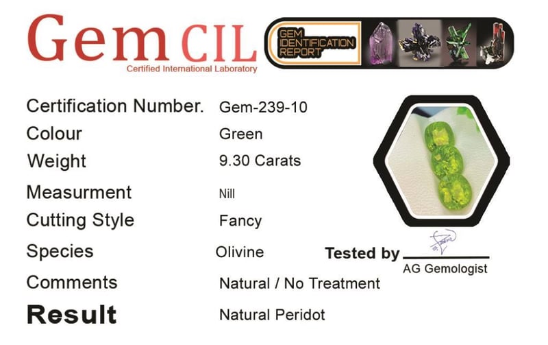 9.30 CARATS NATURAL LUSTROUS PERIDOT 9.30 Carats Natural Lustrous PeridotStone = Natural PeridotWeight = 9.30 CaratsColour = Green Cut = Fancy Note = Gem Cil, Certified, Precise Custom Cut (Not Commercial) Condition: Good - Refer Images 0488465+10