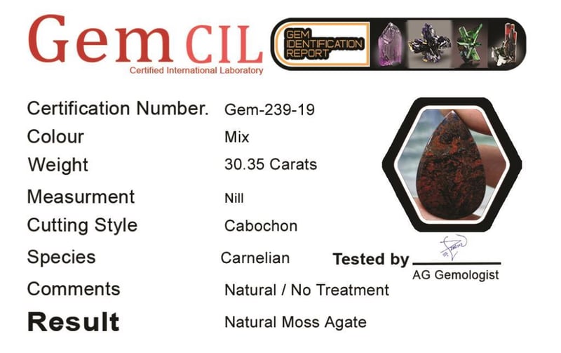 30.35 CARATS NATURAL MOSS AGATE 30.35 Carats Natural Moss AgateStone = Moss AgateWeight = 30.35 Carats Treatment = No Treatment (Natural)Cut = Cabochon Quantity = 1Note = Gem Cil, Certified, Condition: Good - Refer Images 0488465+19