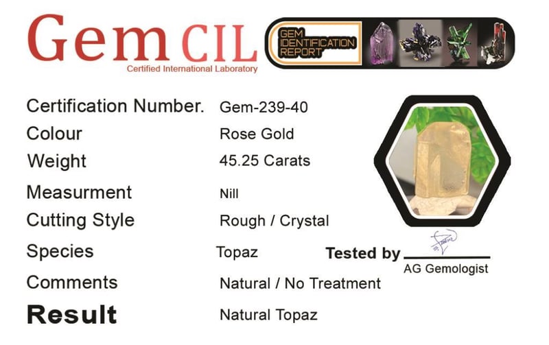 45.25 CARATS NATURALLY TERMINATED IMPERIAL ROSE GOLD TOPAZ SPECIMEN 45.25 Carats Naturally Terminated Imperial Rose Gold Topaz SpecimenStone = Natural TopazWeight = 45.25 Carats Colour = Rose Gold Cut = Naturally TerminatedLustre = Excellent Note = {Natural Termination Is Collectable}, Gem Cil, Certified Condition: Good - Refer Images 0488465+40