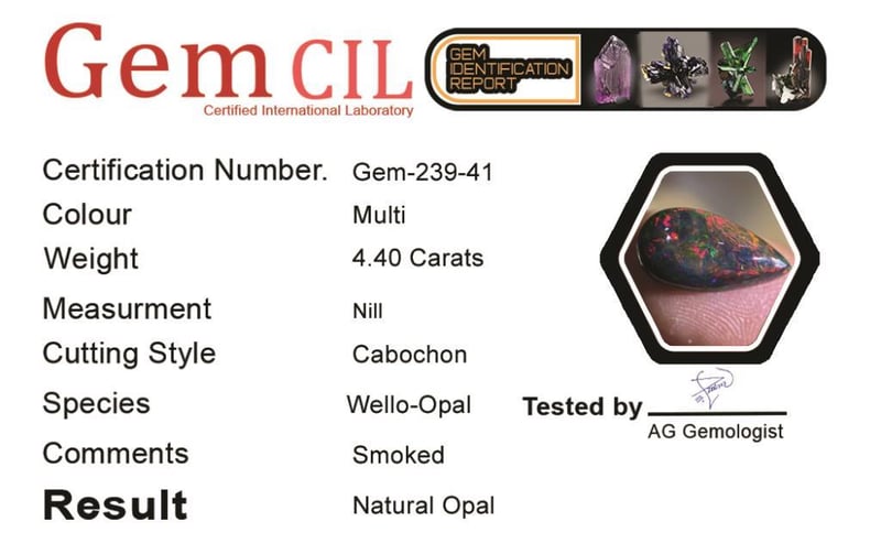 4.40 CARATS NATURAL WELLO-BLACK OPAL 4.40 Carats Natural Wello-Black Opal Stone = OpalWeight = 4.40 CaratsColour = Multi-Colour Treatment = SmokedCut = Cabochon Note = Picture Taken Under Light, Gem Cil, Certified. Condition: Good - Refer Images 0488465+41