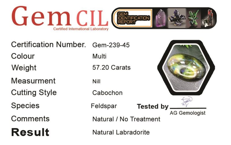 57.20 CARATS NATURAL LABRADORITE 57.20 Carats Natural Labradorite Stone = LabradoriteWeight = 57.20 CaratsColour = MultiCut = CabochonTreatment = No, Natural Quantity = 1Note = Gem Cil, Certified, Condition: Good - Refer Images 0488465+45