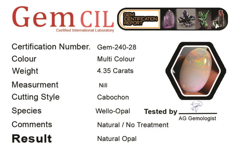 5.00 CARATS NATURAL FIERY WELLO OPAL 5.00 Carats Natural Fiery Wello OpalStone = Natural OpalWeight = 5.00 Carats Colour = Multi ColourCut = Cabochon Treatment = Natural, No TreatmentNote = Gem Cil, Certified Pic Taken Under Light Condition: Good - Refer Images 0488572+28