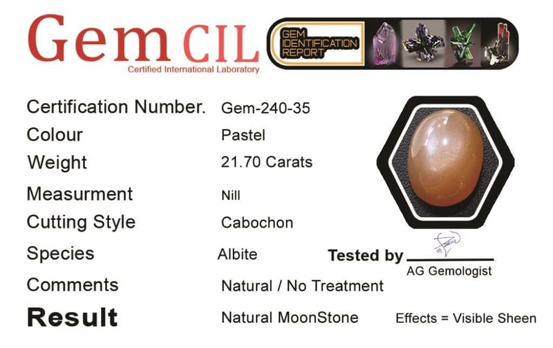 18.50 CARATS NATURAL MOONSTONE 18.50 Carats Natural MoonstoneStone = Natural MoonstoneWeight = 18.50 Carats Colour = Pastel Cut = Cabochon Lustre = ExcellentEffect = Nice Visible SheenNote = Picture Taken Under Light Gem Cil, Certified, Condition: Good - Refer Images 0488572+35