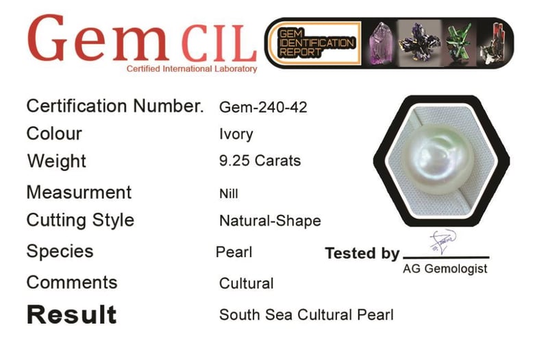 9.85 CARATS SOUTH SEA PEARL 9.85 Carats South Sea Pearl Stone = South Sea Pearl Weight = 9.85 Carats Treatment = CulturalQuantity = 1Note = Gem Cil, Certified, Condition: Good - Refer Images 0488572+42